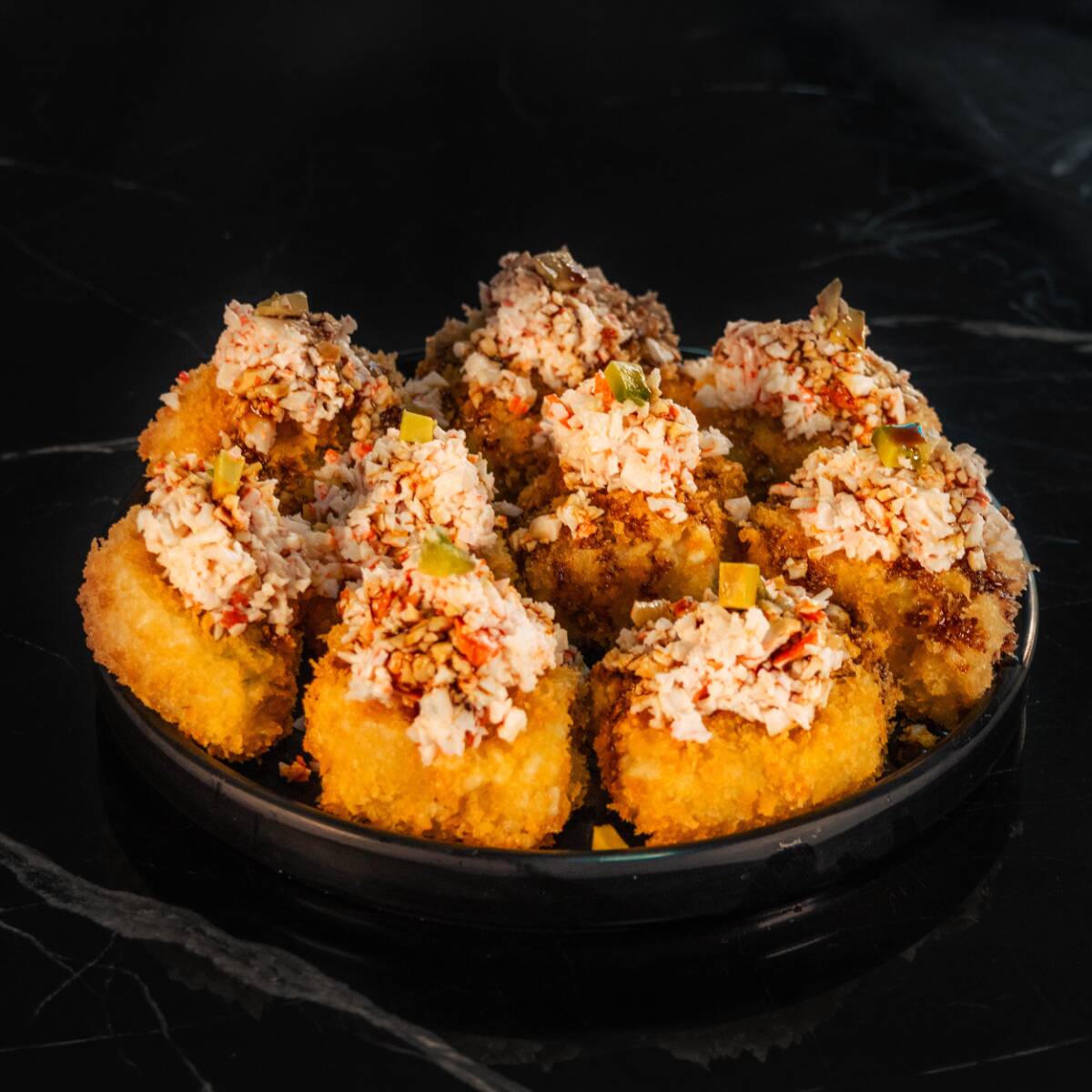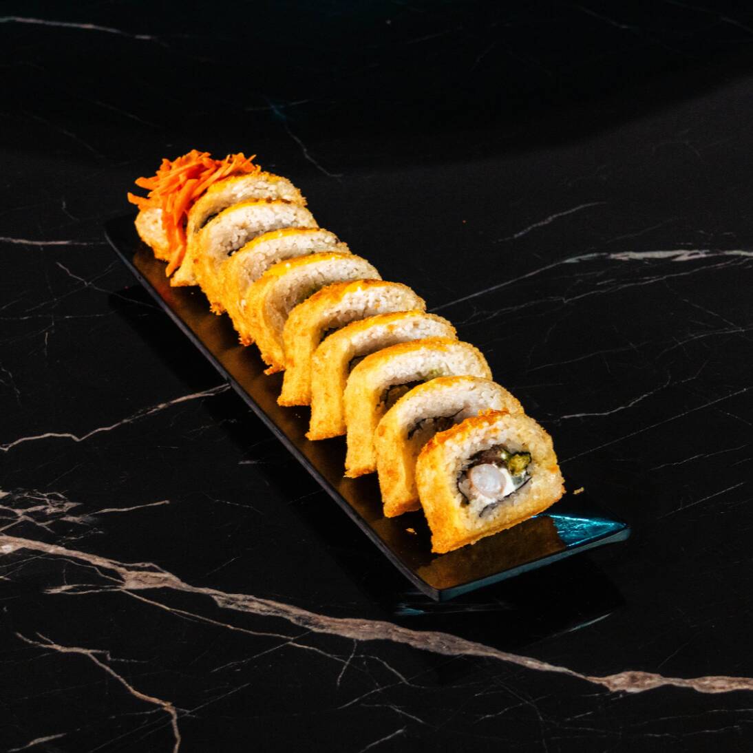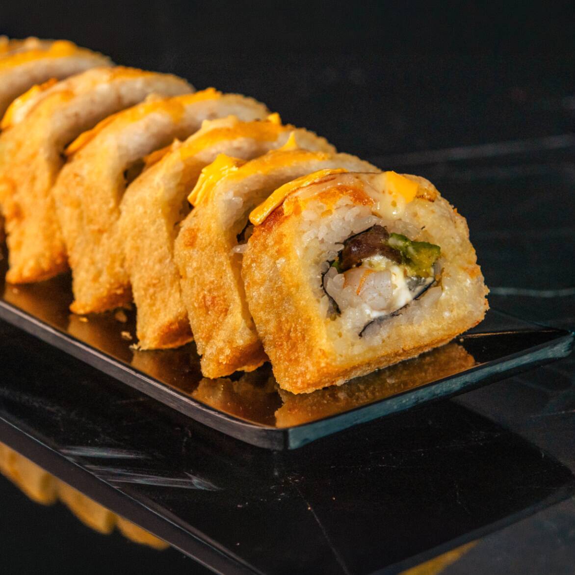 Rollo empanizado relleno de cangrejo, queso crema y aguacate cubierto de topping de quesos spicy y chicharrón de atún.