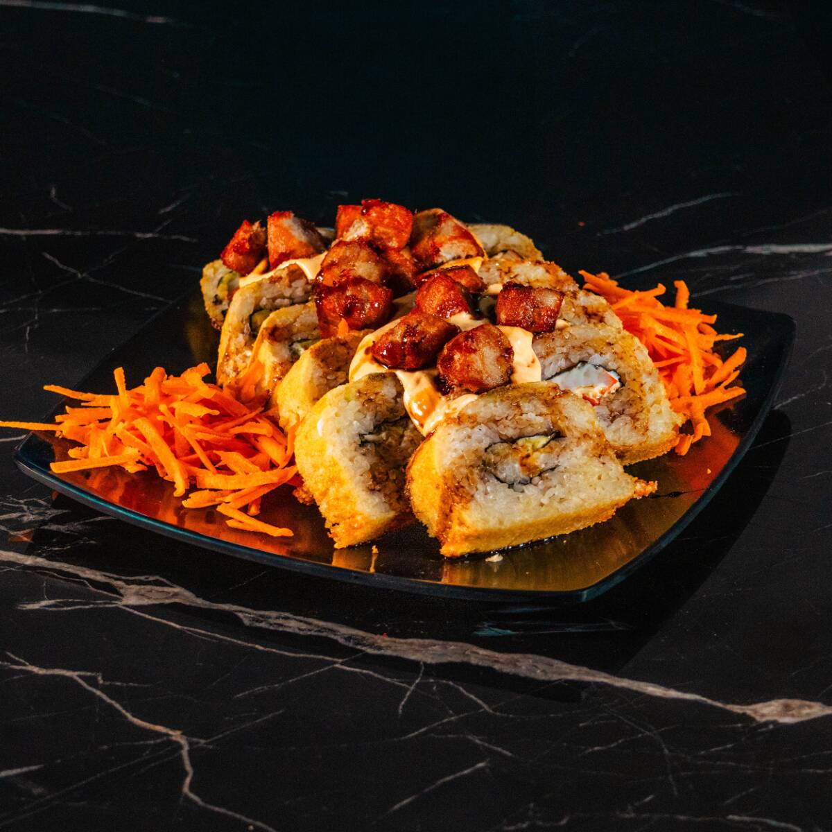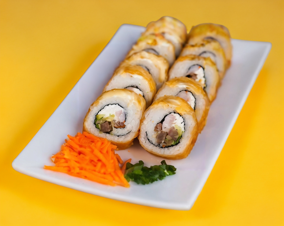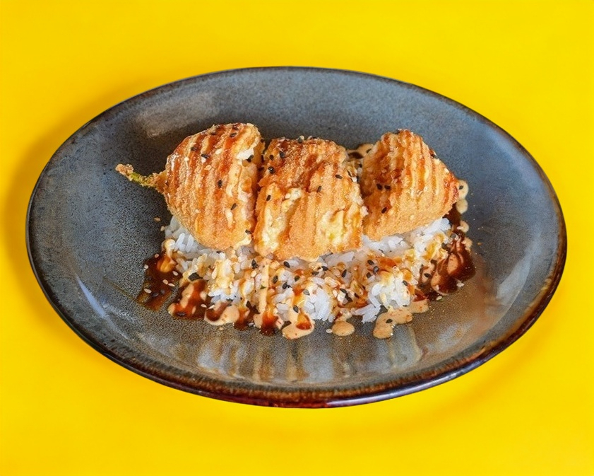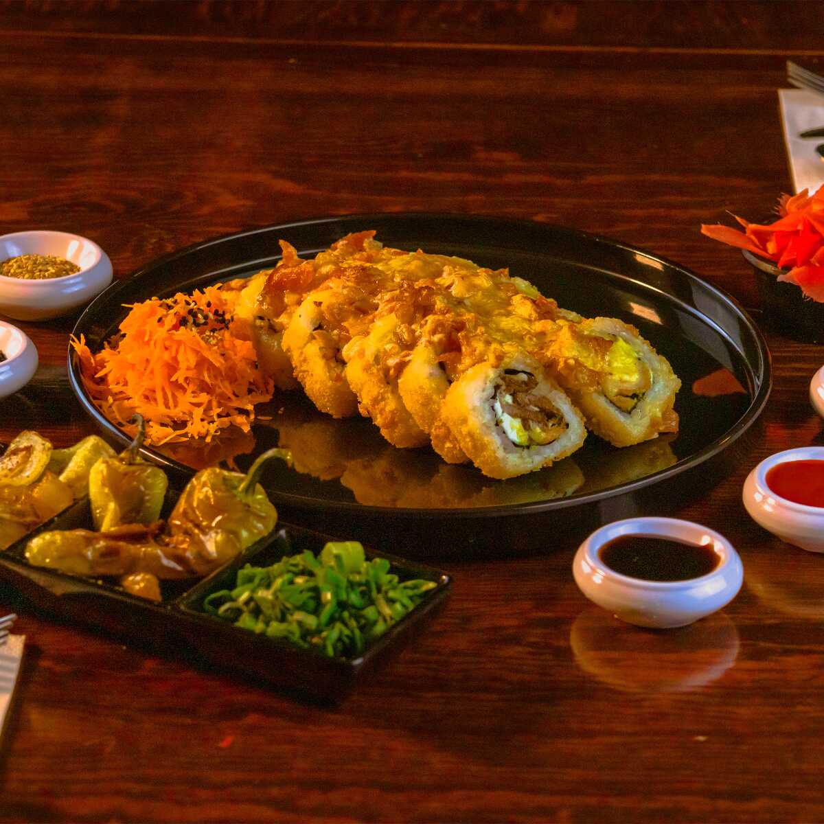 Rollo empanizado relleno de cangrejo, queso crema y aguacate cubierto de topping de quesos spicy y chicharrón de atún.
