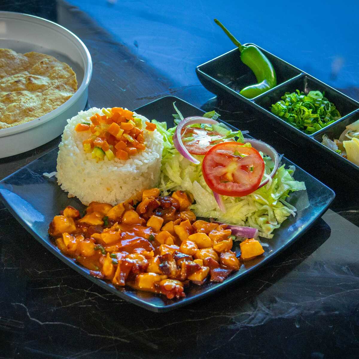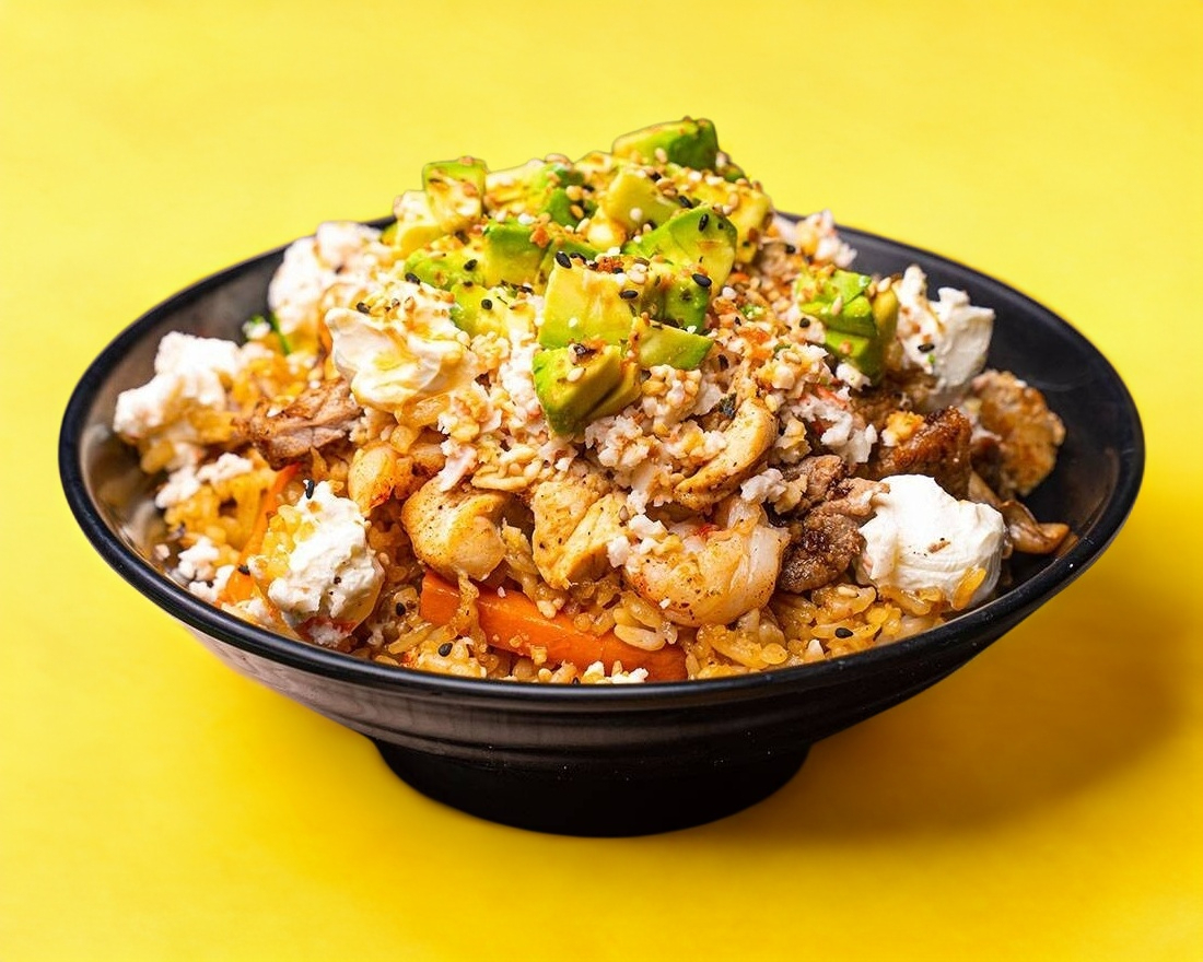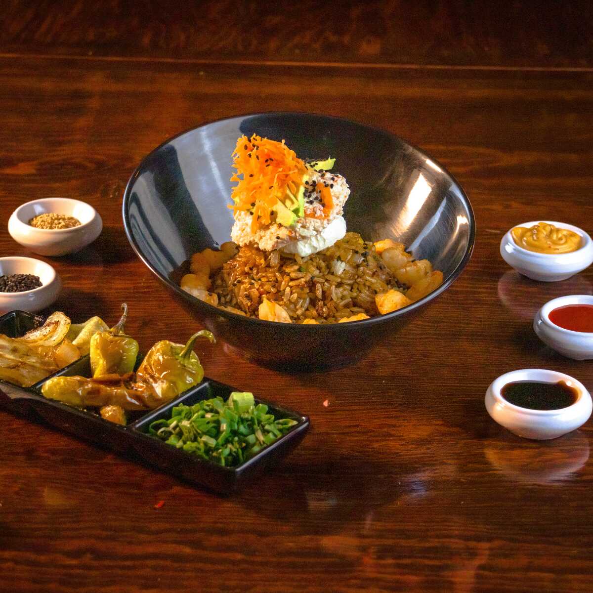 Arroz frito con calabaza, zanahoria, queso crema, tampico, aguacate y ajonjolí negro.