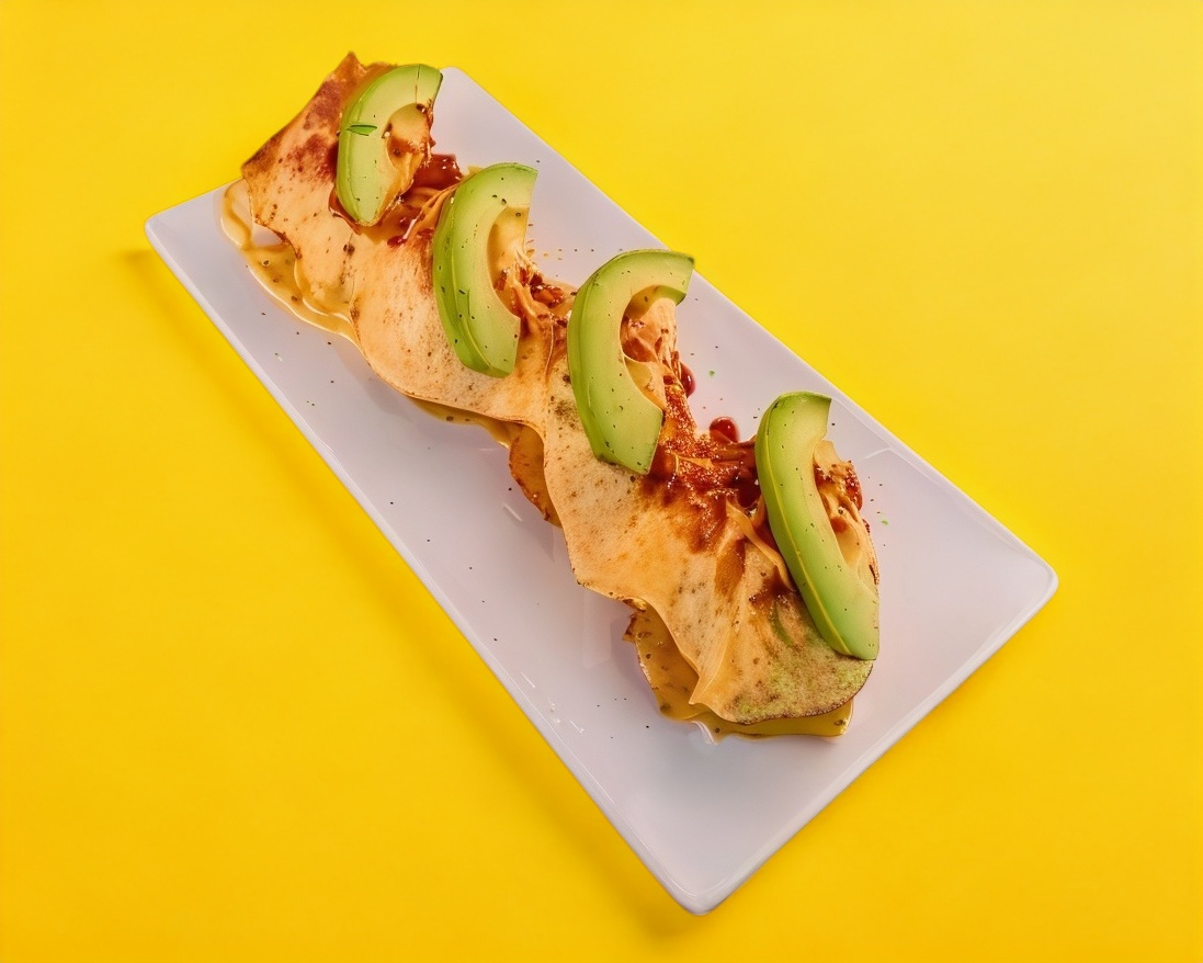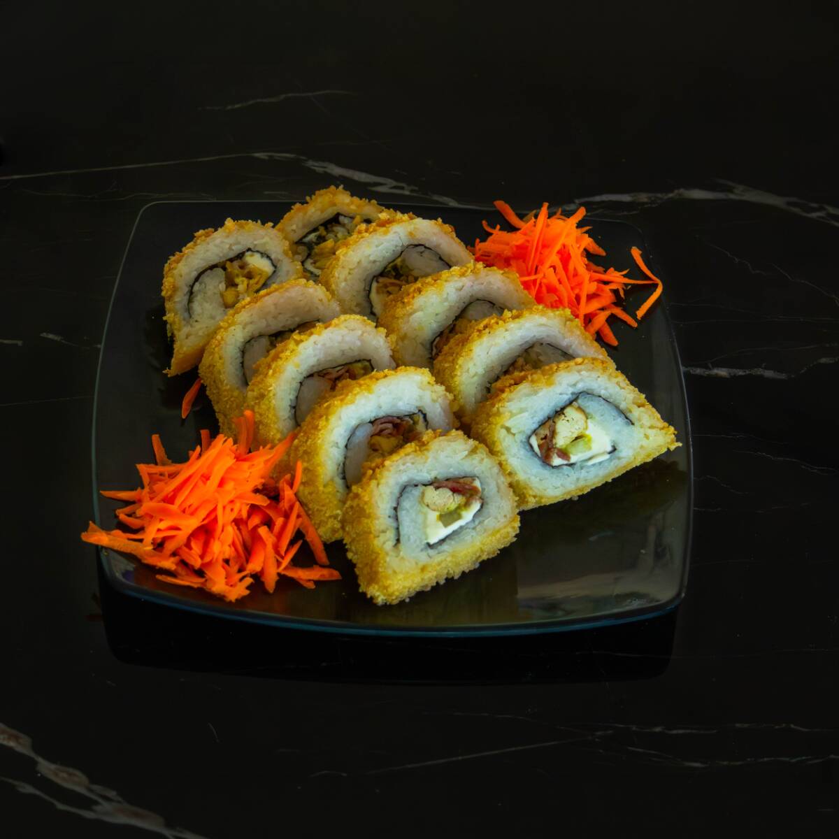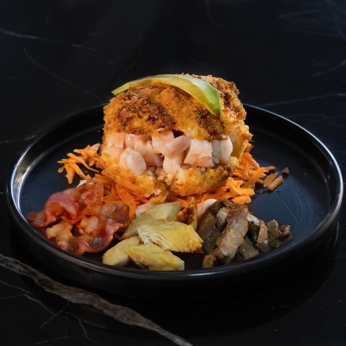 Rollo empanizado relleno de aguacate, queso crema, res y tocino. Coronado con tampico, aguacate y ajonjolí tostado.