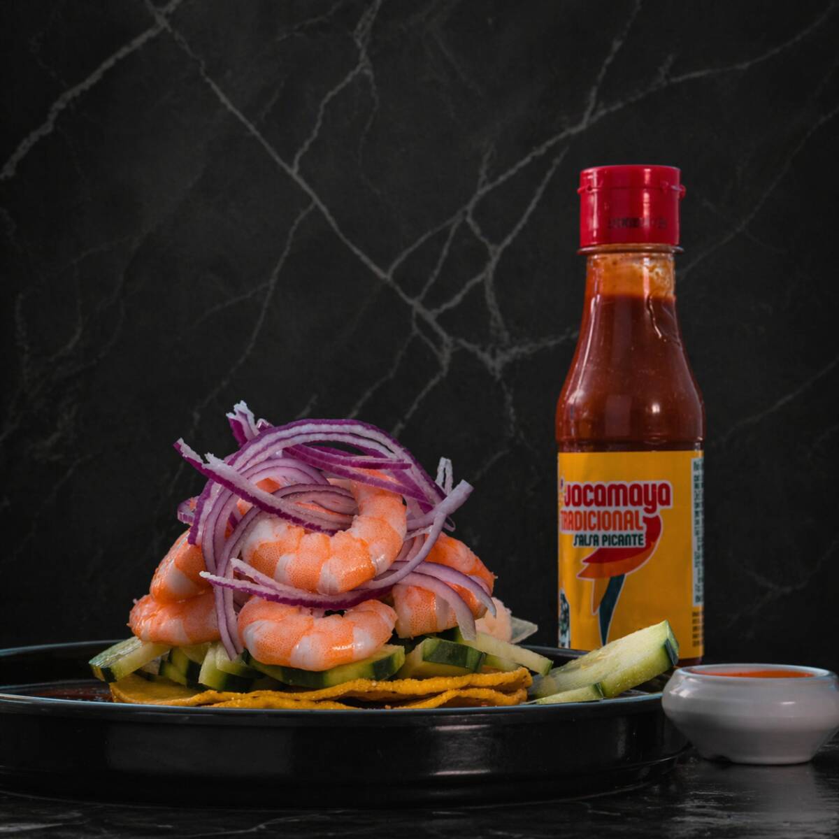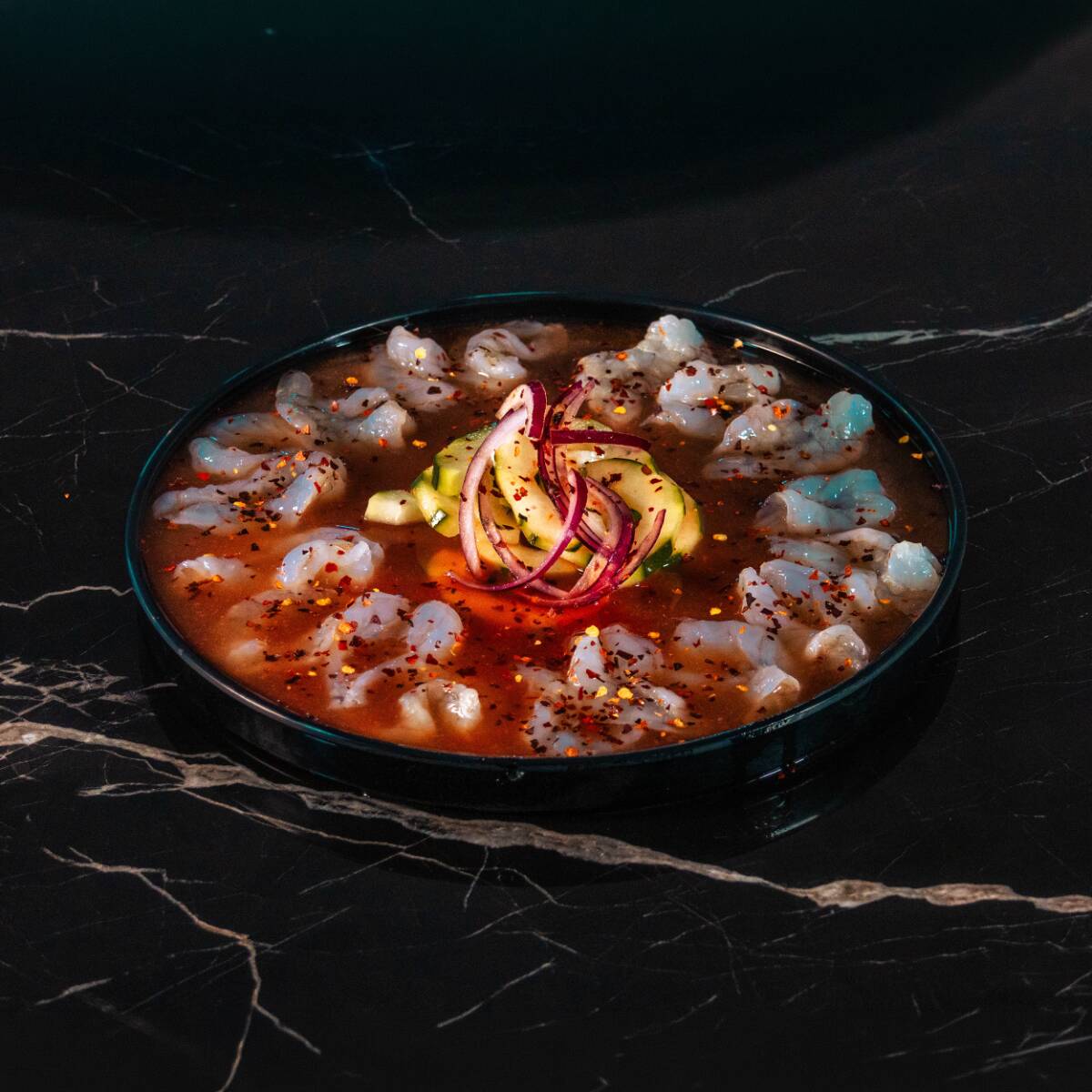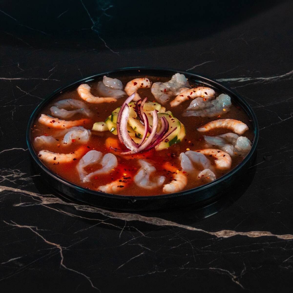 Camarón curtido en limón y salsa de la casa, acompañado de rodajas de pepino y cebolla morada.