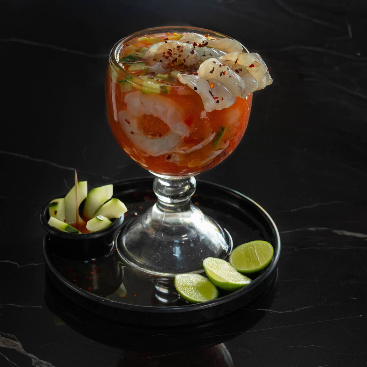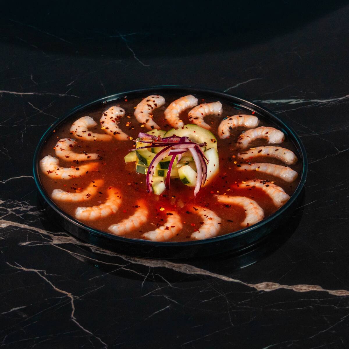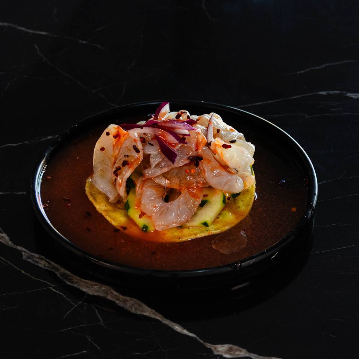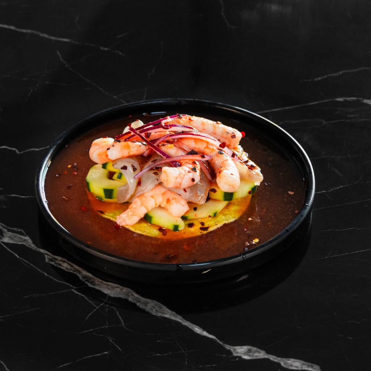 Camarón curtido en limón y salsa de la casa, acompañado de rodajas de pepino y cebolla morada.