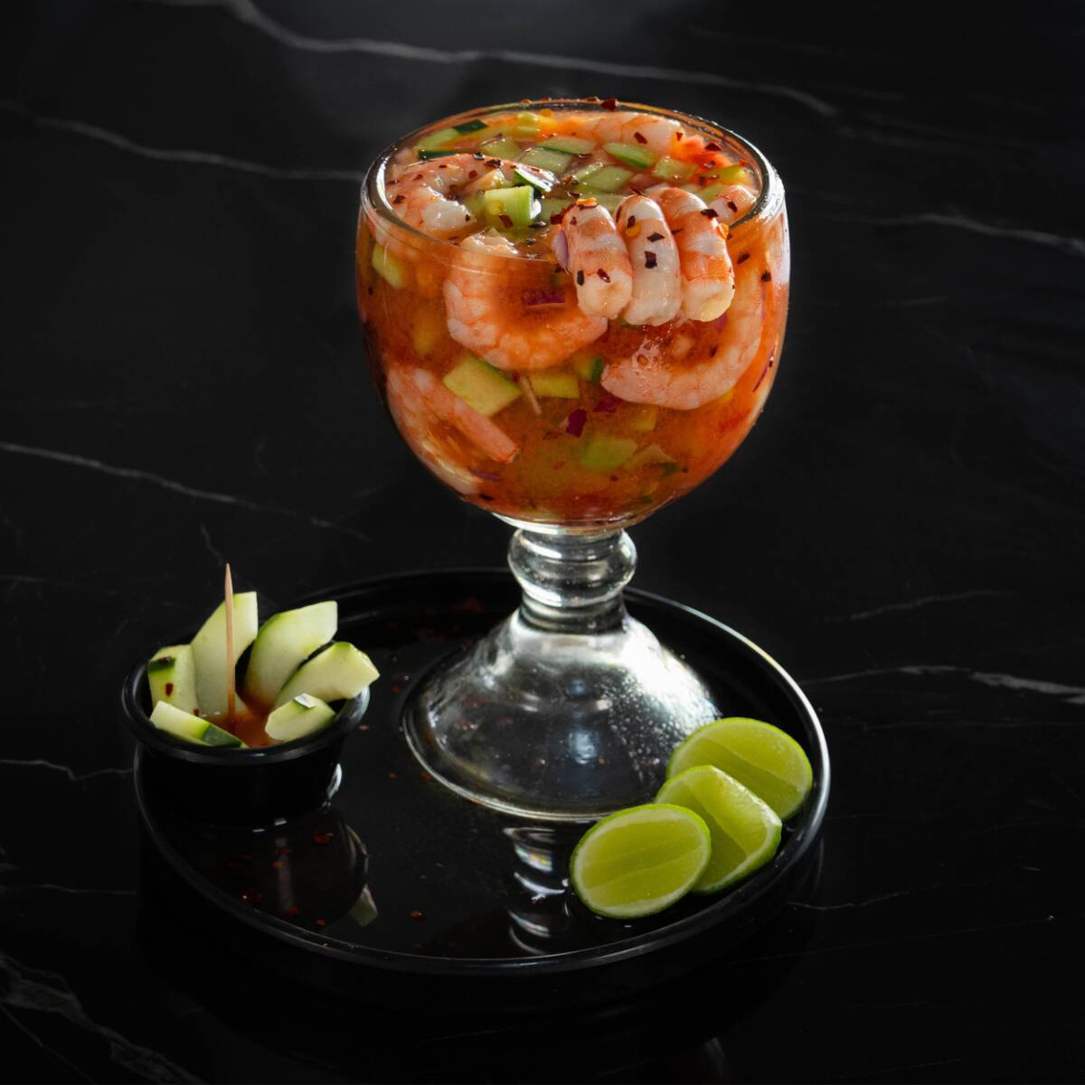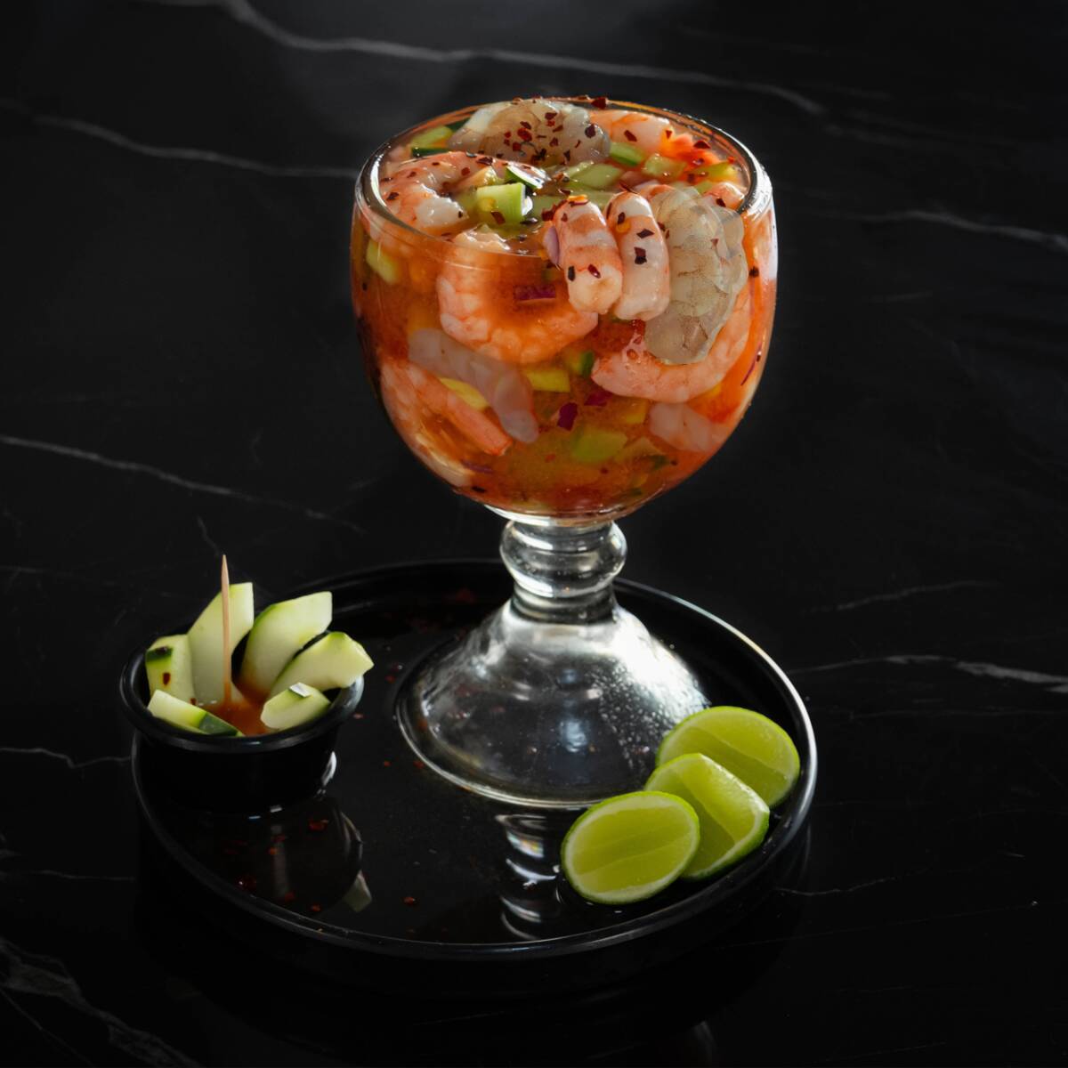 Coctel de camarón cocido en limón y salsa de la casa, acompañado con tomate, cebolla, y pepino.