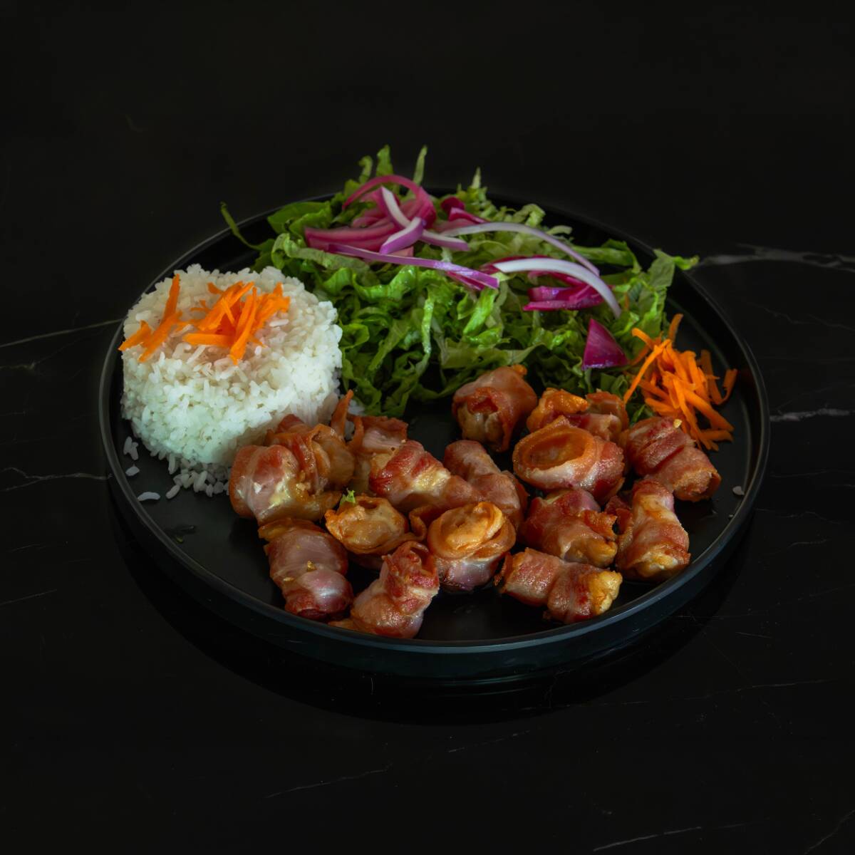 Camarones fritos envueltos en tocino y queso chihuahua.