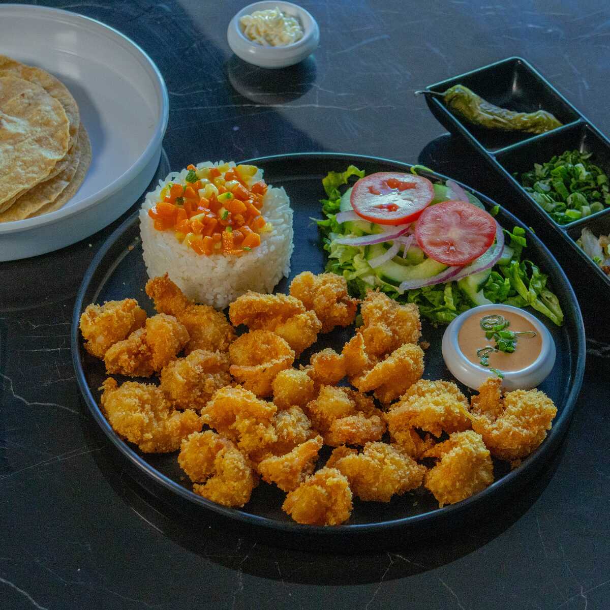 Camarones empanizados, acompañados de arroz a la jardinera y salsa mayonesa spicy.