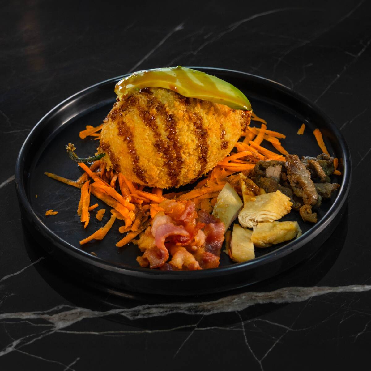 Por dentro res, pollo, queso crema y aguacate. Por fuera mezcla de queso y tocino horneado.