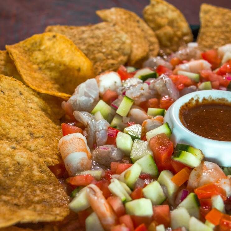 Tostada de camarón cocido y camarón cocido en limón, acompañada de pepino, cebolla morada y salsa de la casa.