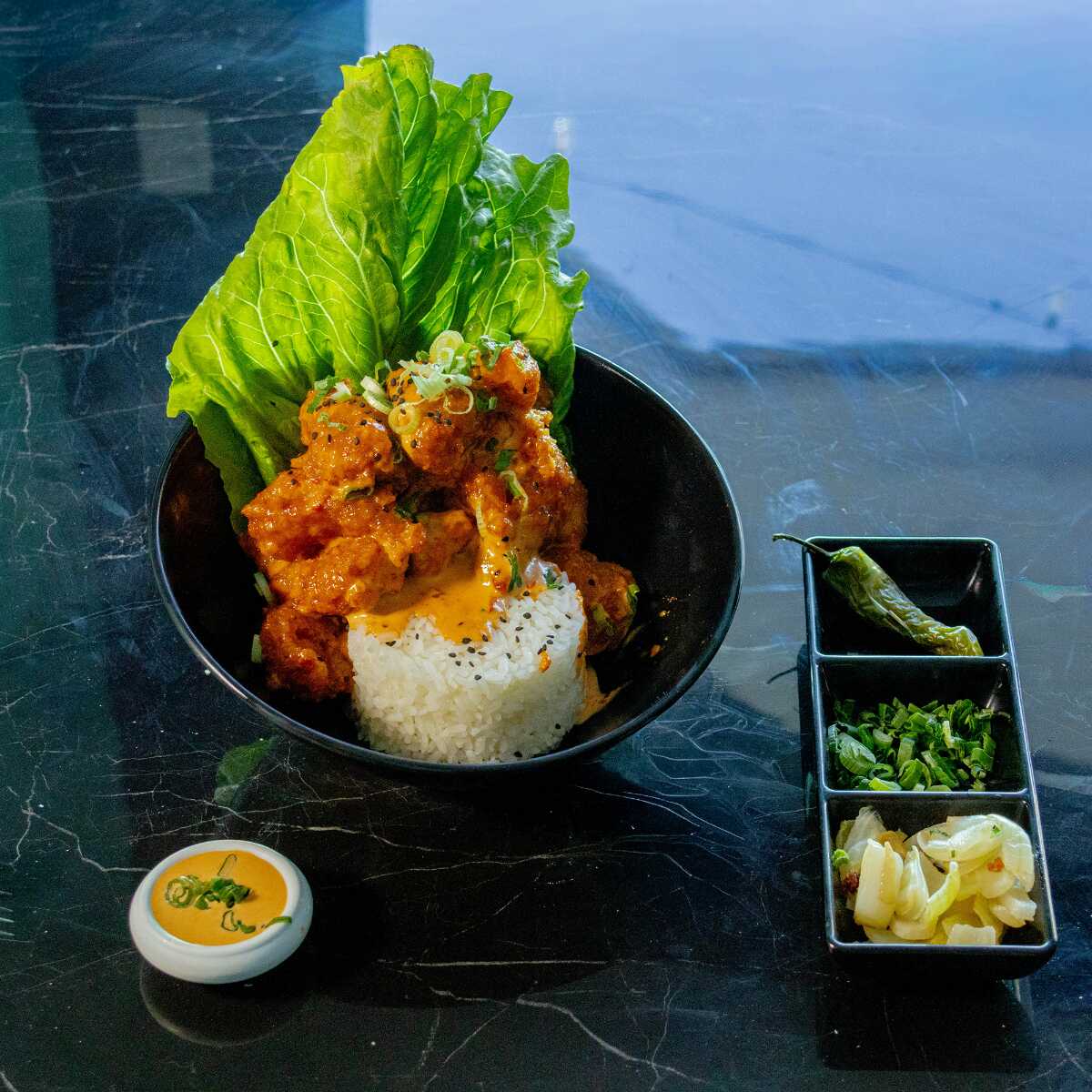 Camarones capeados cubiertos en salsa Roca, con un sabor agridulce spicy.