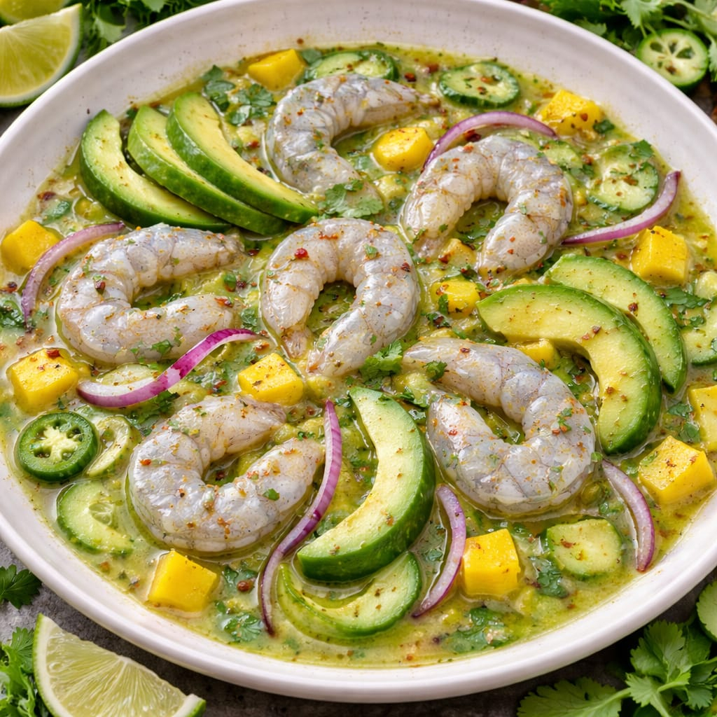 Orden de Delicioso aguachile de camarón estilo mariposa, con cebolla morada, pepino y aguacate, en salsa de mango y especias con opción a escoger el picante, ideal para compartir.