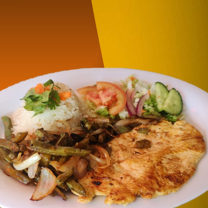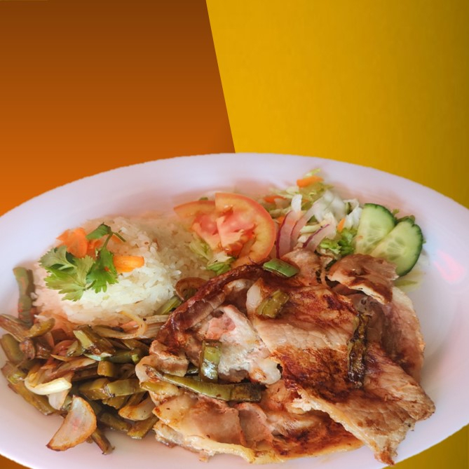 Con arroz o sopa fria, frijoles, ensalada, salsa, tortillas y agua de fruta del dia.