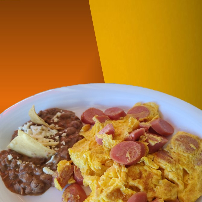 Acompañados con frijoles refritos, incluye café o té, bolillo, fruta y vaso con agua del dia.