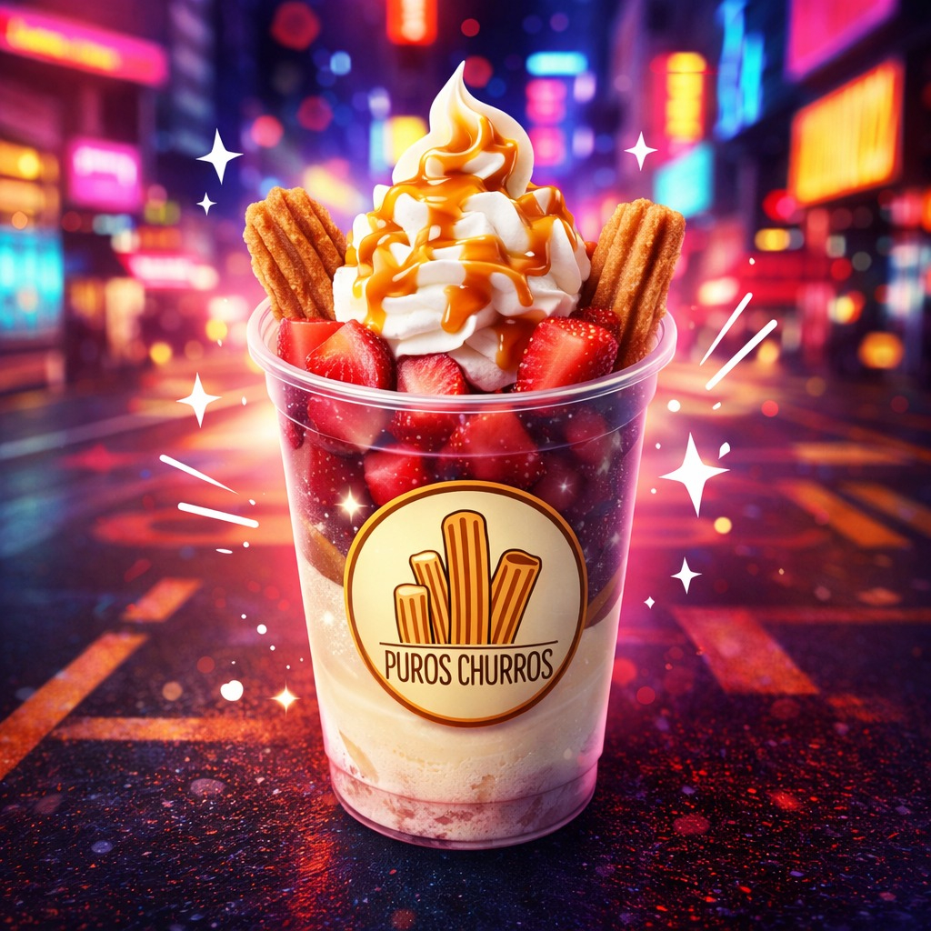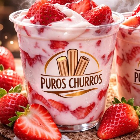 Fresas naturales con helado de vainilla, crema batida, mini churros azucarados, lechera y cajeta. Un postre irresistible lleno de sabor y textura.