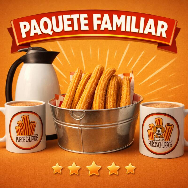 Paquete familiar con 12 churros clásicos, doraditos y espolvoreados con azúcar y canela, acompañados de 1 litro de delicioso chocolate caliente o frío. Rinde para 3–4 personas Todas nuestras bebidas se preparan con leche deslactosada