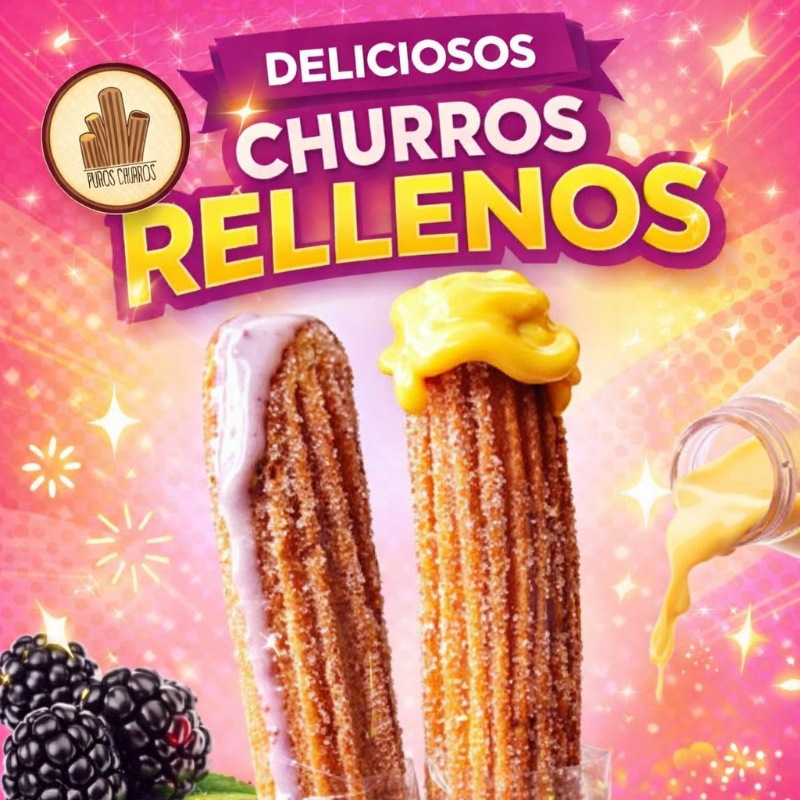 Churro recién hecho, espolvoreado con azúcar y canela, relleno con el sabor de tu elección. Crujiente por fuera y suave por dentro.