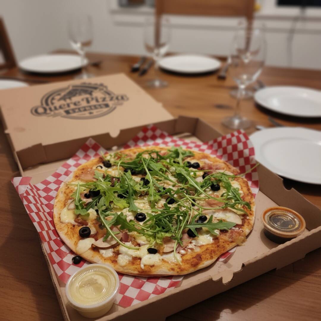 Pizza con base de tomate y mozzarella, coronada con finas lonchas de jamón serrano, arugula fresca, pera y queso de cabra.