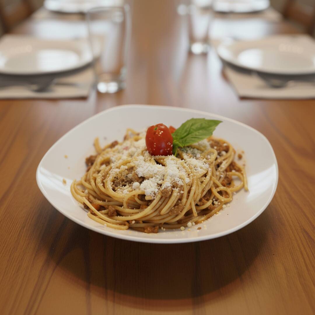 Pasta servida con una rica salsa boloñesa a base de carne molida, tomate, cebolla y especias italianas.