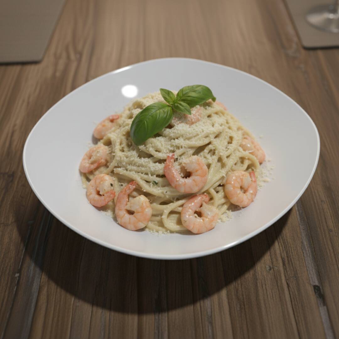 Delicada pasta salteada con ajo y cebolla, en una suave crema con jugo de limón Eureka, acompañada de jugosos camarones y coronada con queso parmesano. Fresca, cremosa y con un toque cítrico irresistible.
