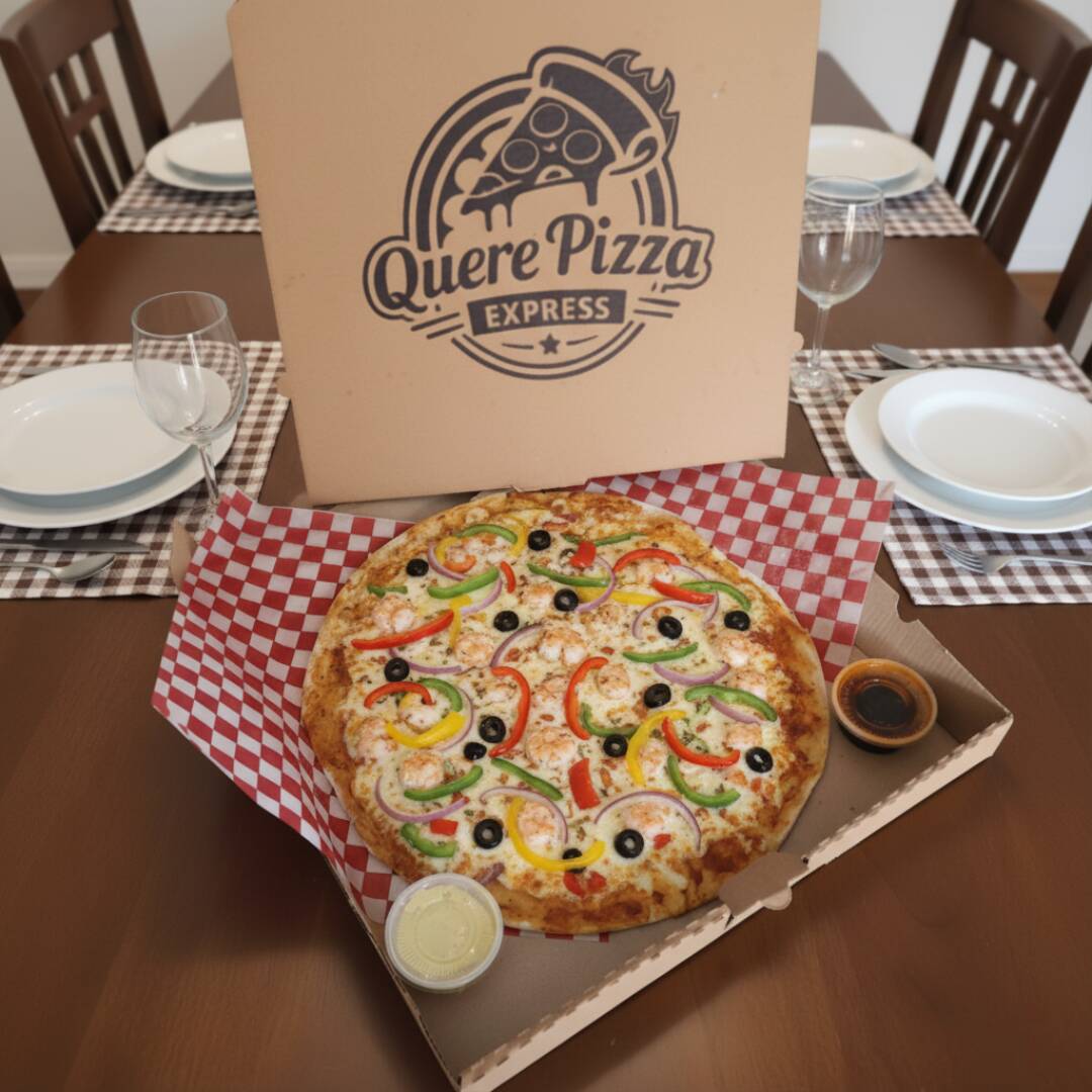 Pizza con salsa de tomate, queso mozzarella, camarones, aceituna negra, cebolla morada y pimientos.
