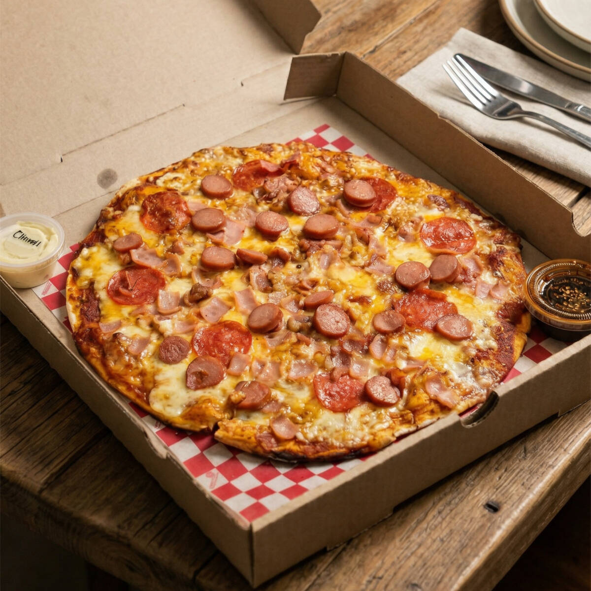 Una explosión de sabor. Salchicha, tocino crujiente, jamón jugoso y pepperoni se combinan sobre queso fundido y masa artesanal para una experiencia intensa en cada rebanada.