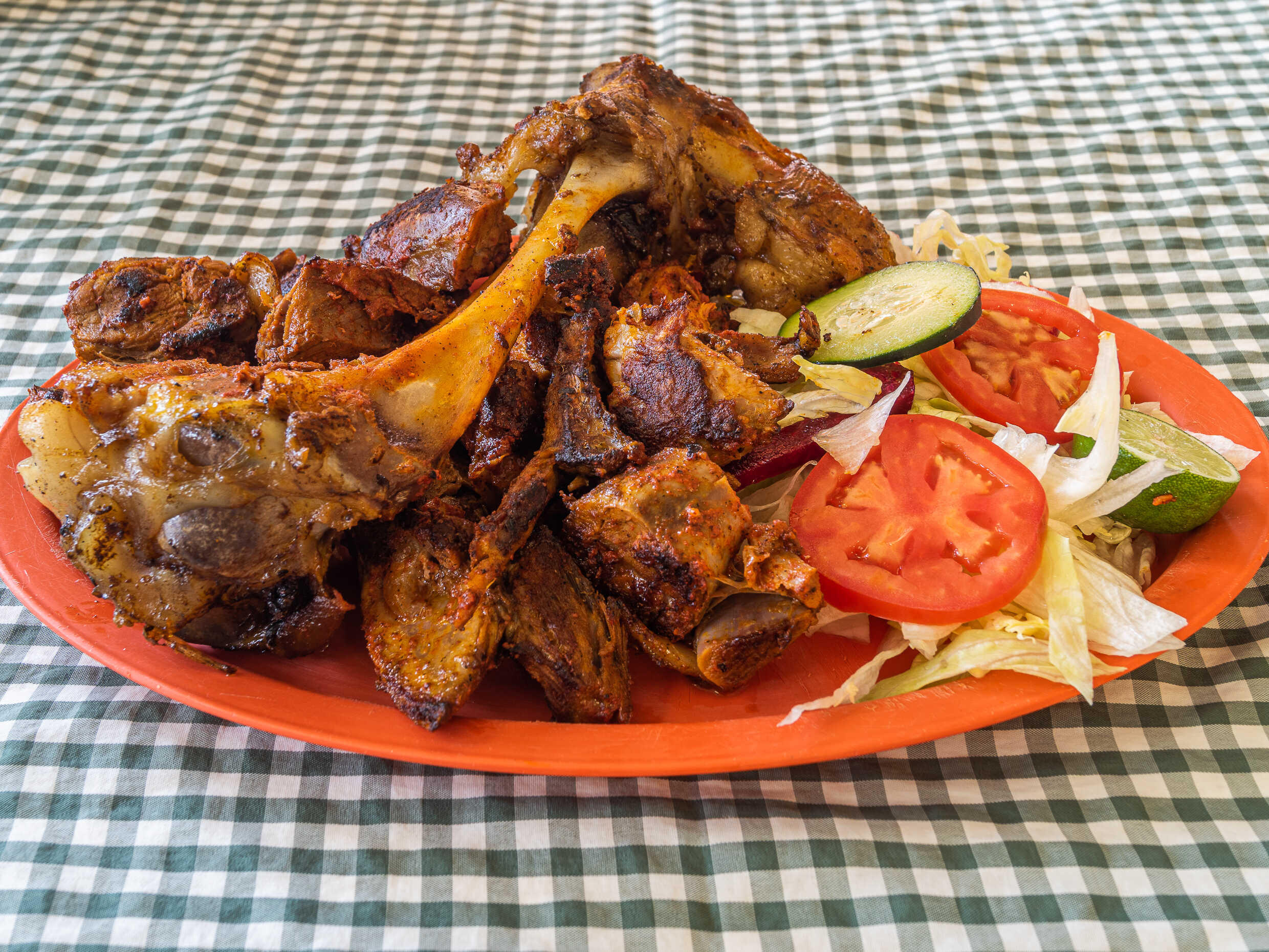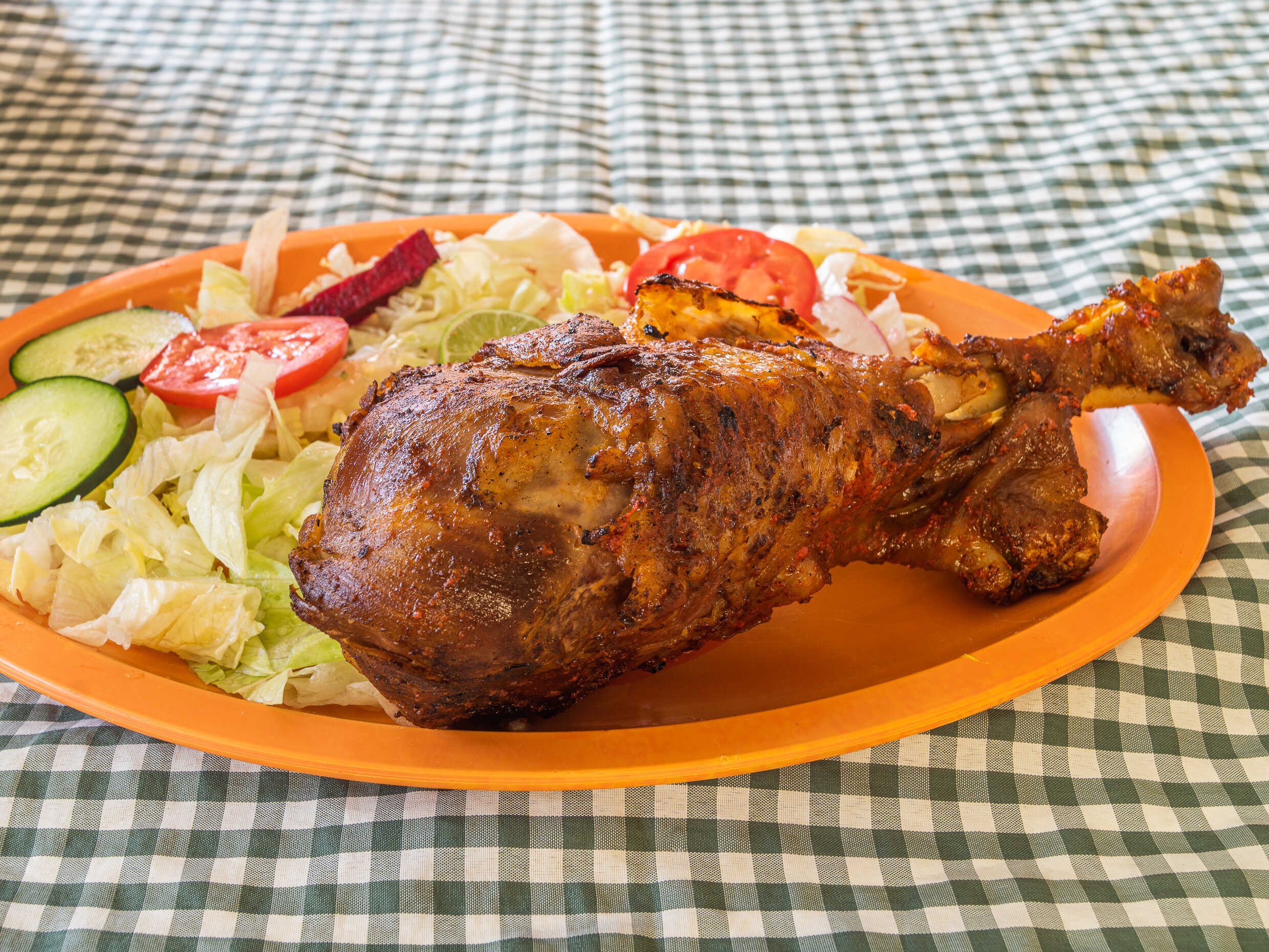 Asado y adobado, acompañada de ensalada y salsa.