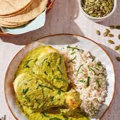 Pollo (muslo y pierna) sazonado en mole verde en envase de 500g. Incluye Tortillas y Salsa de la Casa