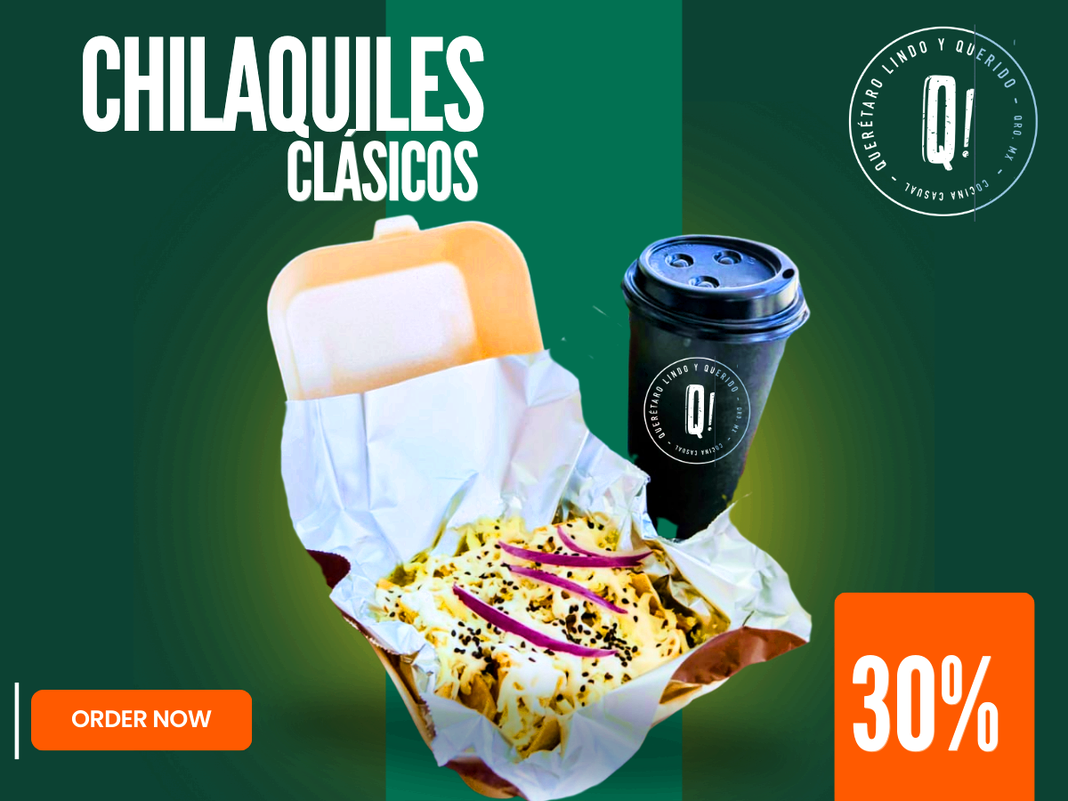 Totopos crujientes bañados en salsa roja, verde o suiza, coronados con crema fresca, aguacate, queso mozzarella, cebolla morada, frijoles y pan artesanal, con huevo.