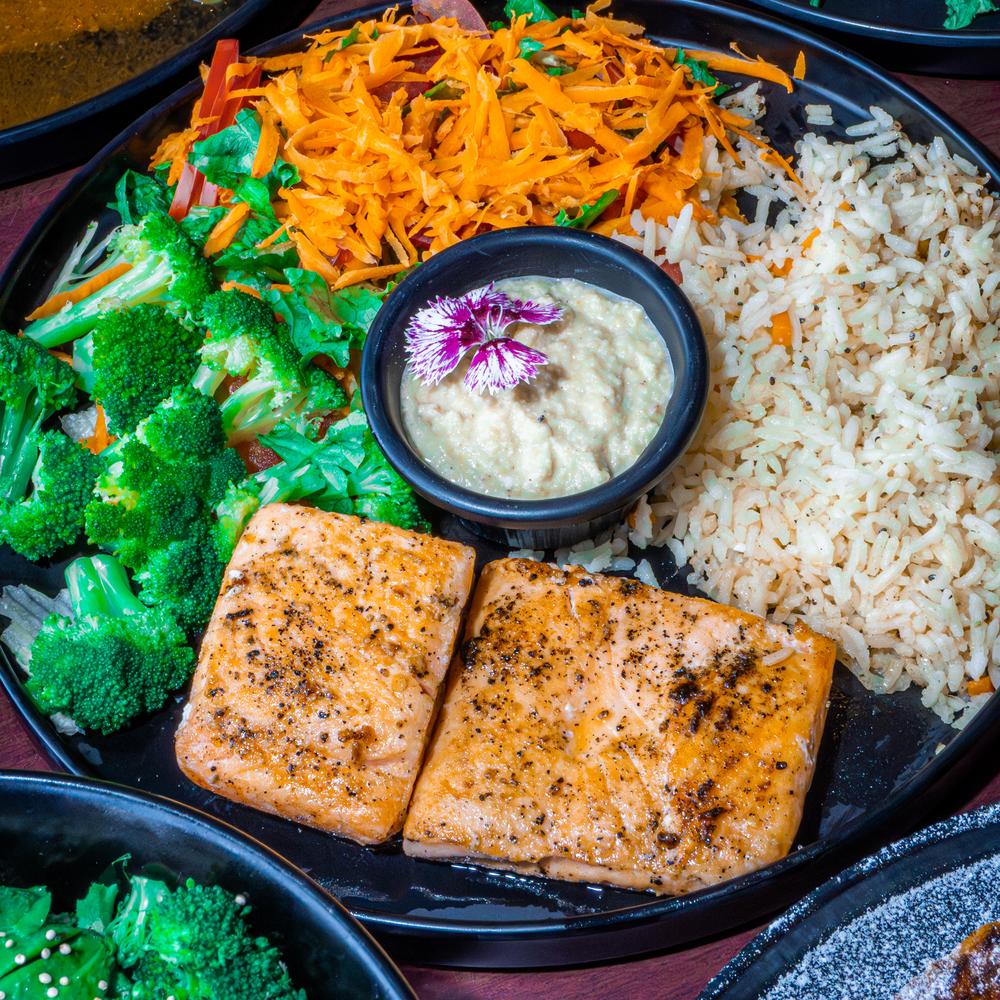 Salmón sobre arroz esponjoso y hummus cremoso, acompañado de brócoli al vapor, ensalada fresca y chía, con aderezo a elegir.