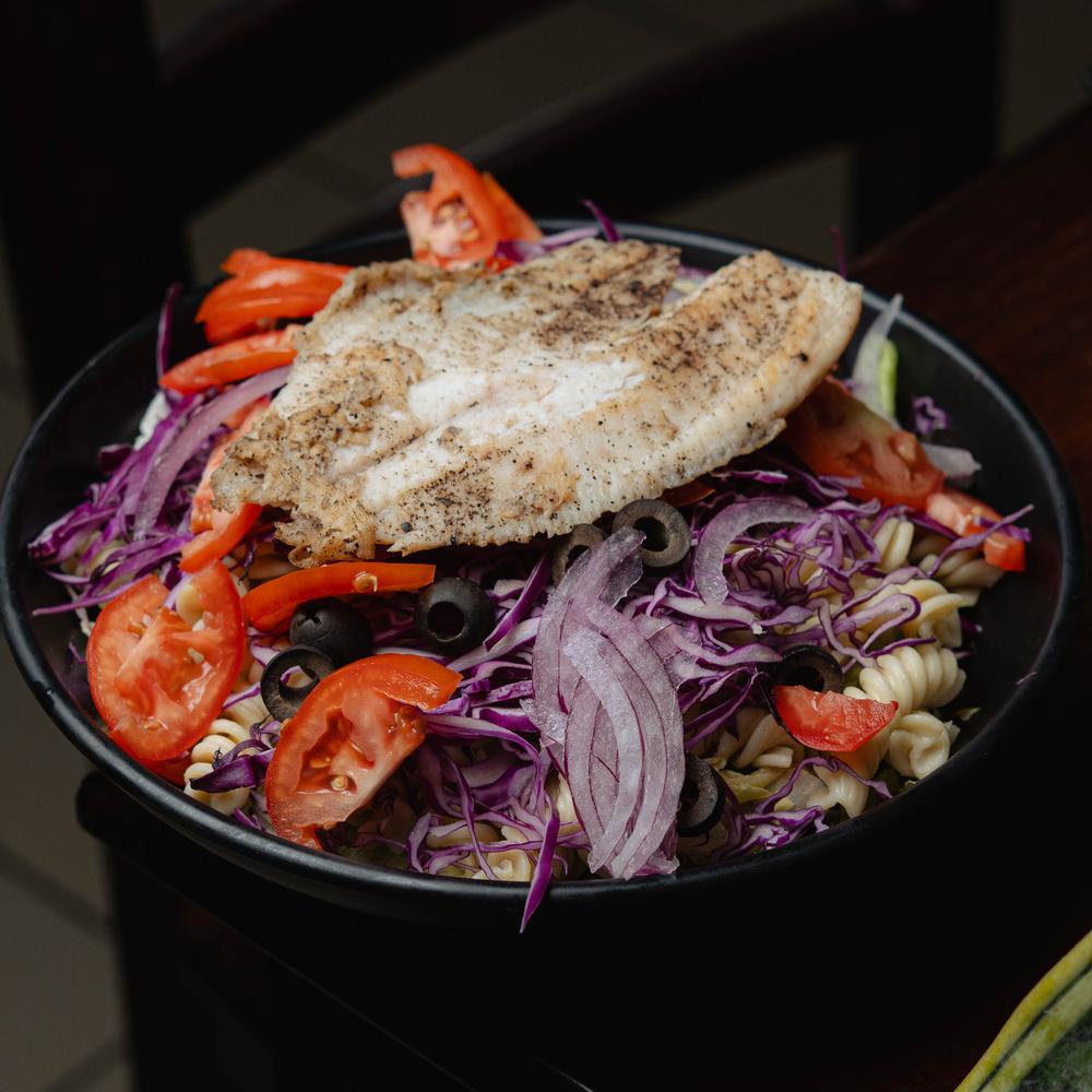 Tilapia, col morada, lechuga, espinaca con pasta al dente, zanahoria, aceituna negra, cebolla morada y jitomate, coronado con ajonjolí negro, con aderezo a elegir.
