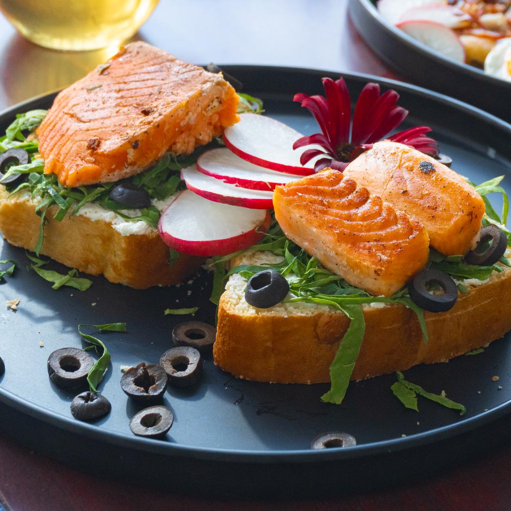 Pan artesanal con salmón, queso de cabra, espinaca fresca, aceituna negra, reducción de balsámico, ajonjolí caramelizado, rábanos y aderezo de la casa.