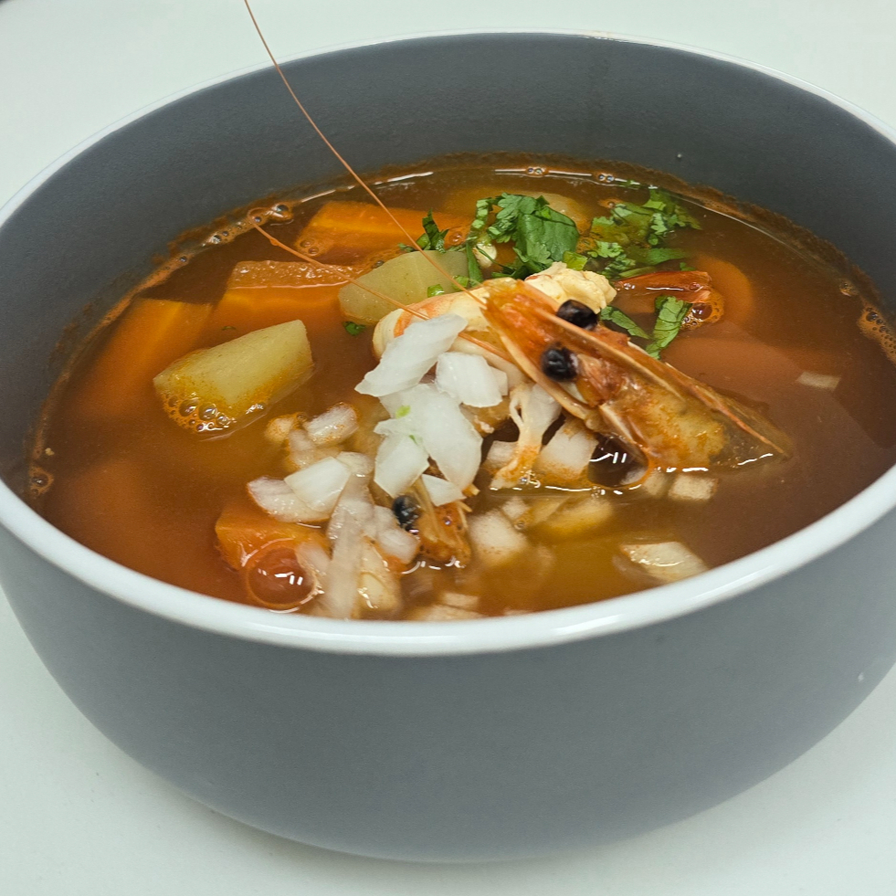 camarón, pulpo, papas, zanahorias, chile guajillo molido en caldo, adicional en salsero cilantro, cebolla picada y limón