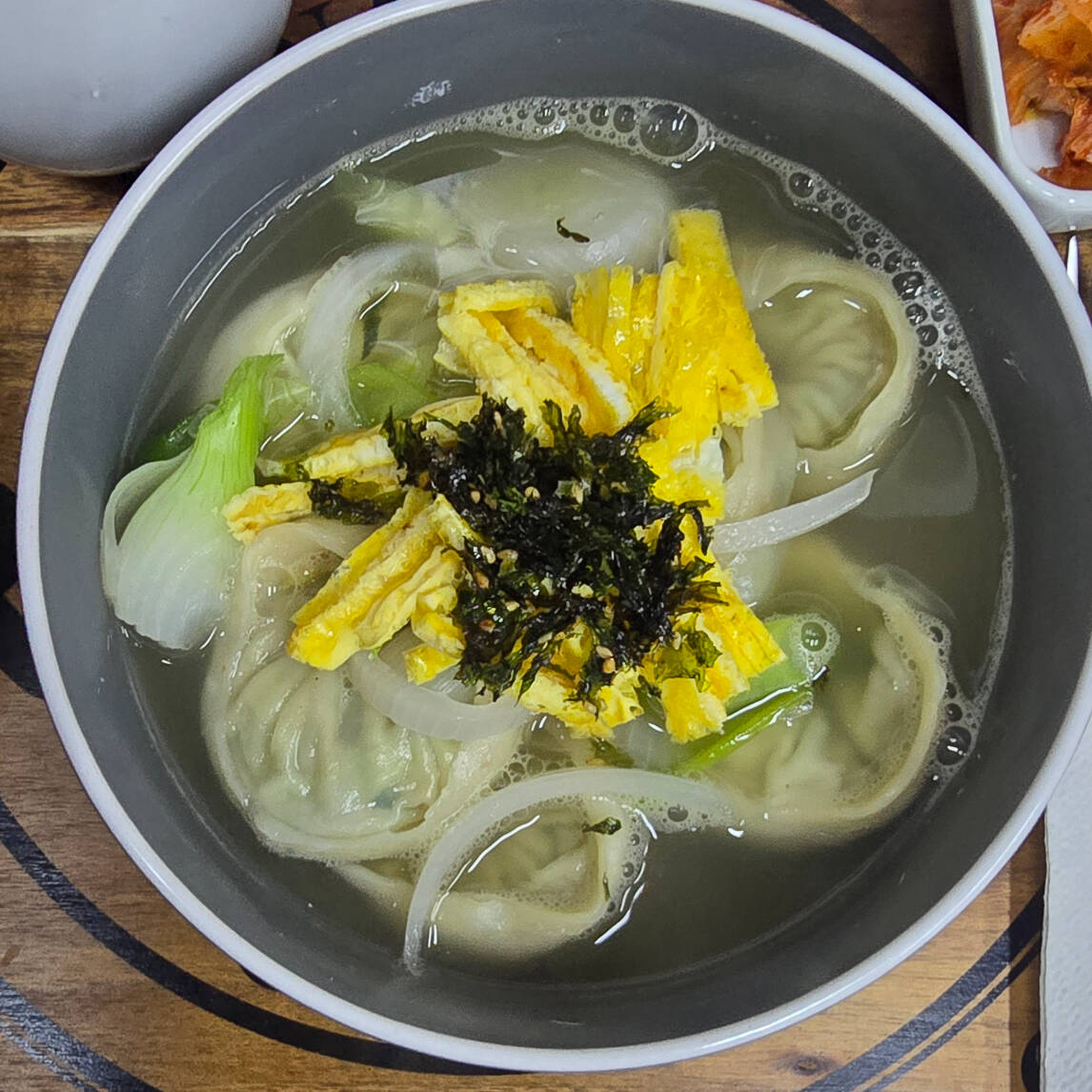 dumpligs en caldo especial con tiritas de huevo y algas fritas