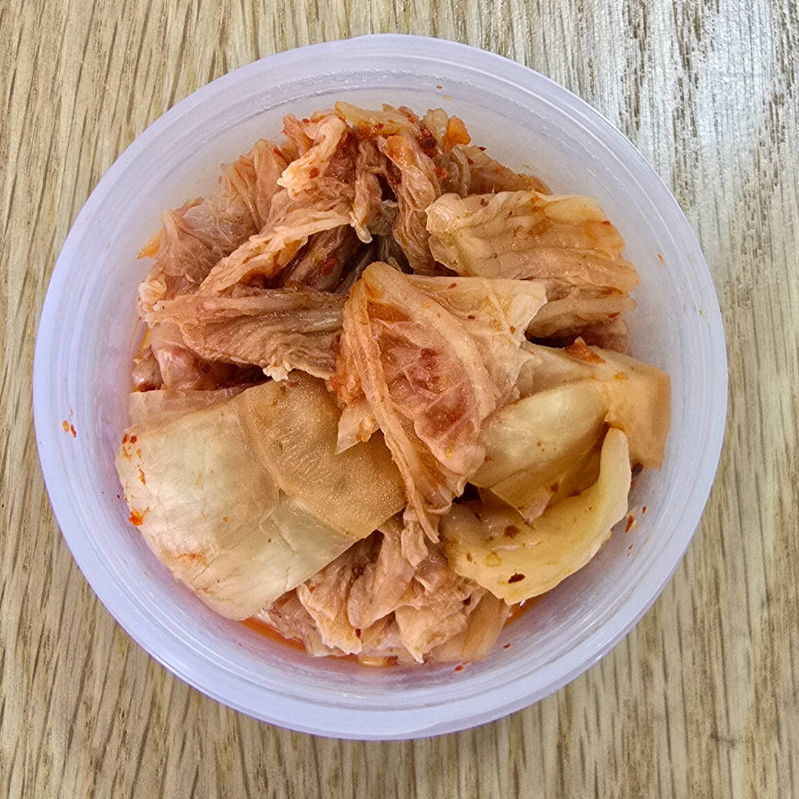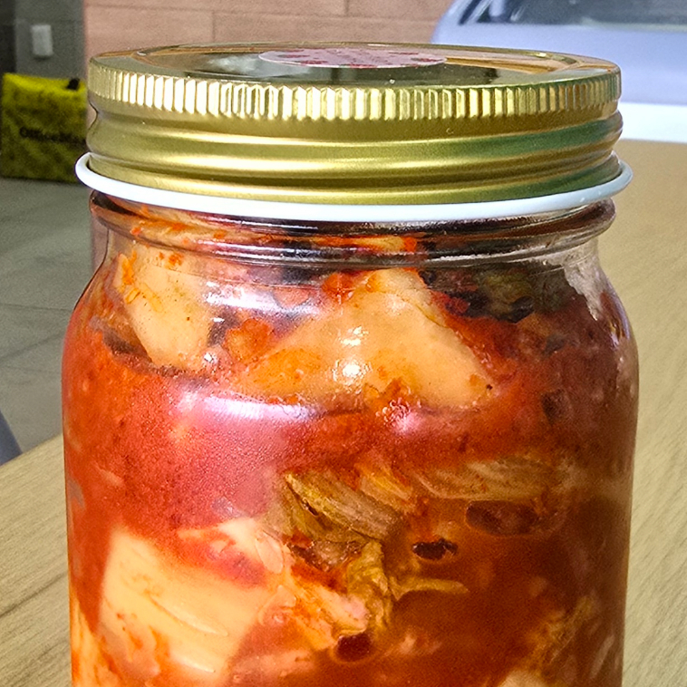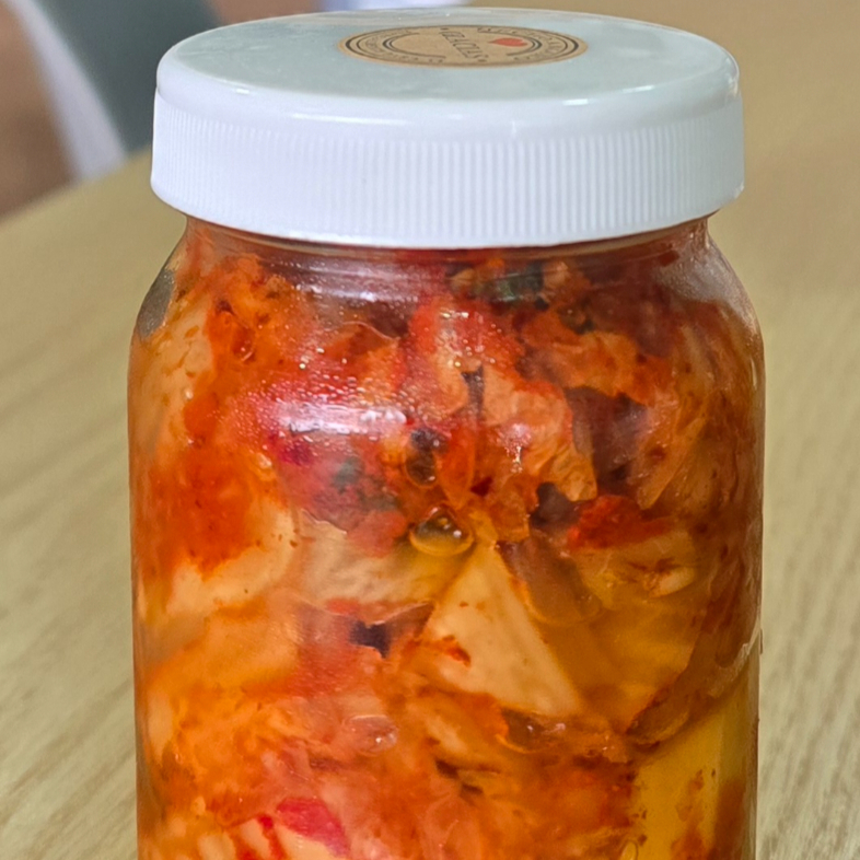 Col chino fermentado con chile y licuado de frutas como pera y manzana envuelto con salsa de chile roja importada