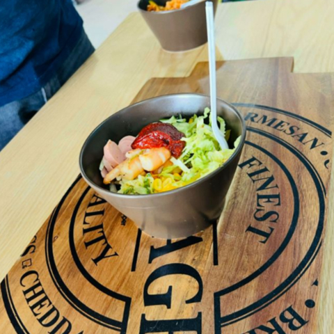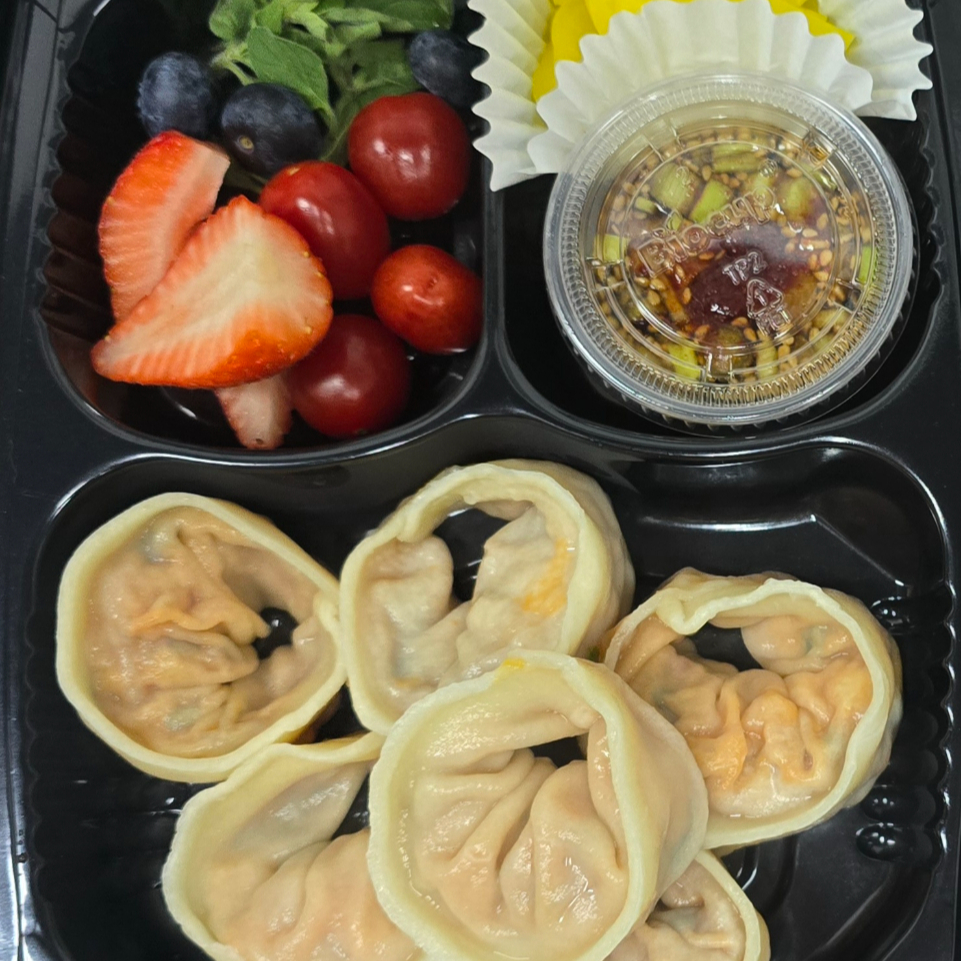 dumpling verdura en vapor, ensalada con salsa soya especial