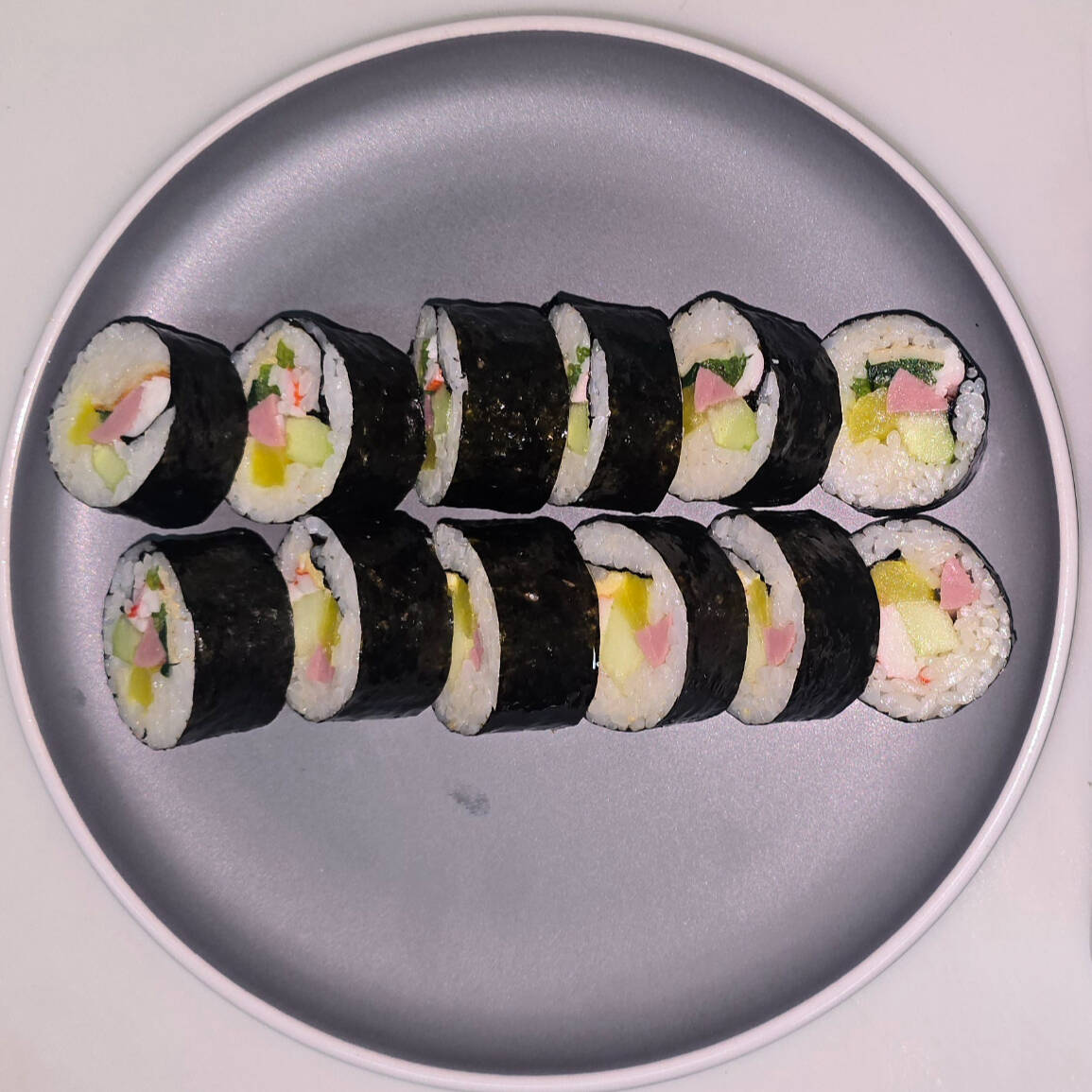 arroz blanco, zanahoria, huevo, nabo, espinaca, salchicha, pepino, surimi,envuelto de alga