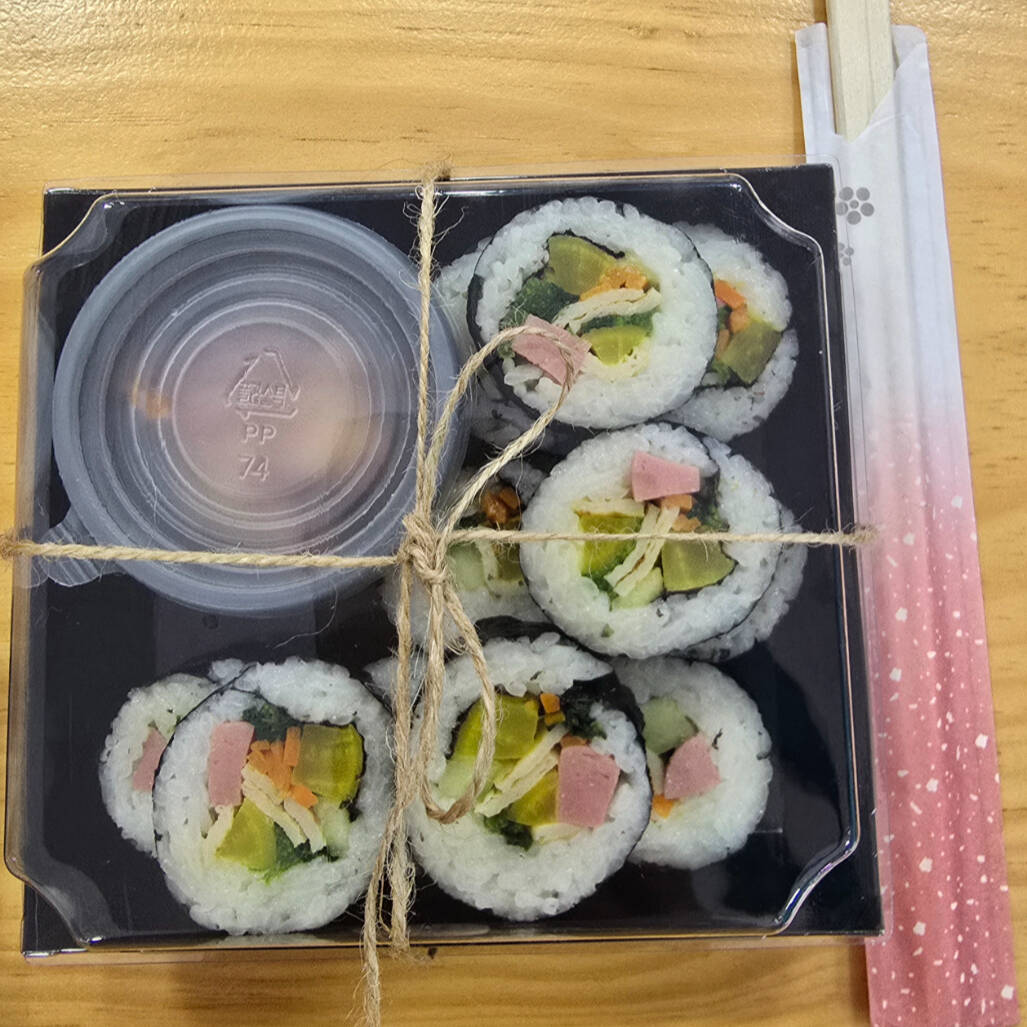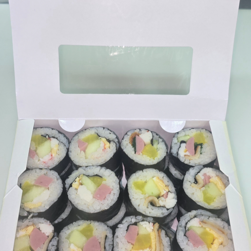 Lunch Box de rollo tradicional de Corea, en Su empaque impecable, rollos tradicional con ingredientes frescos como pepino, surimi, tirita de pasta marisco, rábano, espinaca cocida , salchicha de pavo, acompañado kimchi para que disfruten!!