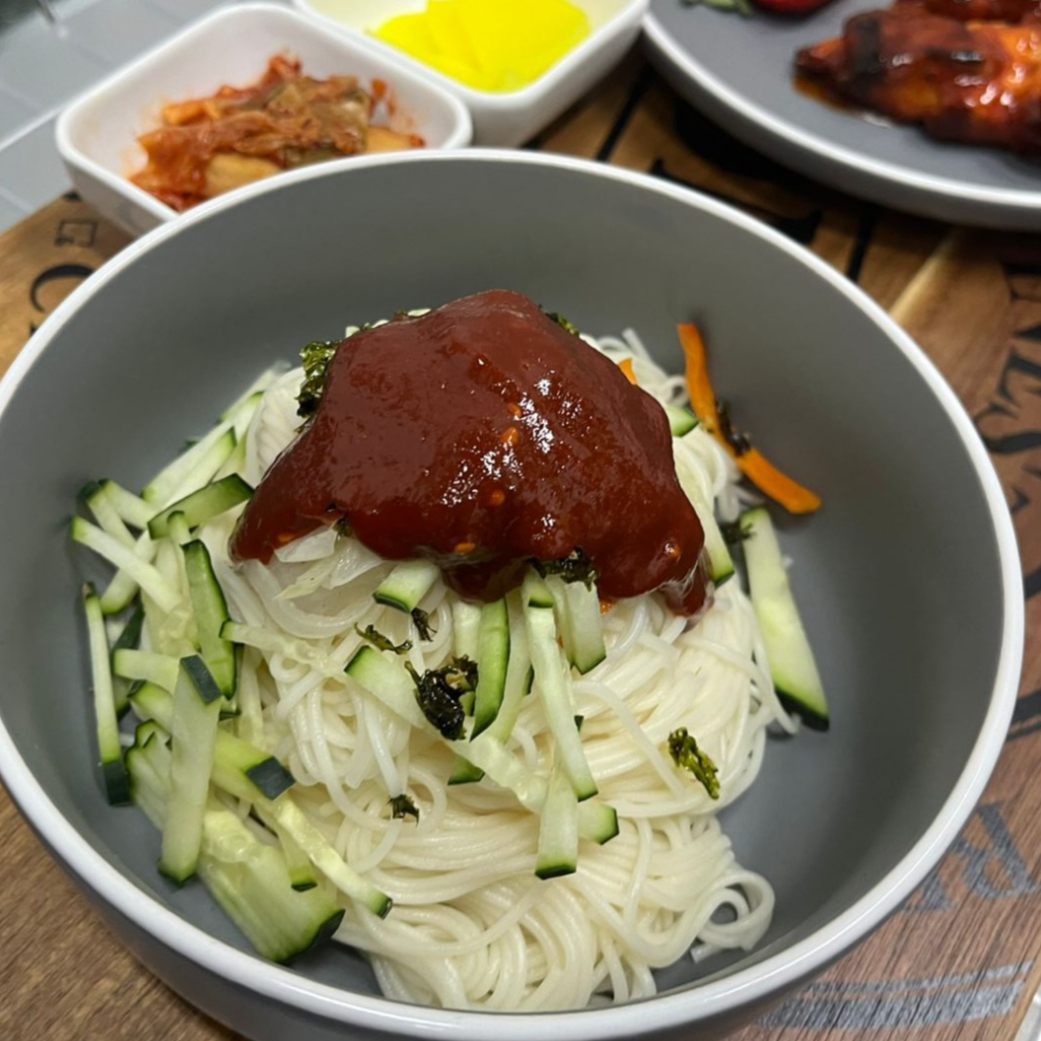 FIDEO DELGADO DE ARROZ COCIDO SECO CON SU SALGA CHILE AGRIDULCE Y PEPINOS PICADOS