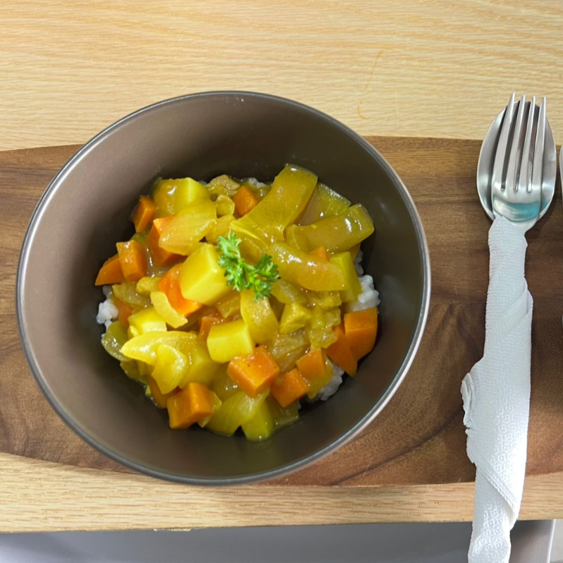 ARROZ COCIDO AL VAPOR BAÑADO CON CURRY PREPARADO CON VERDURAS COMO PAPAS, ZANAHORIAS Y CEBOLLA