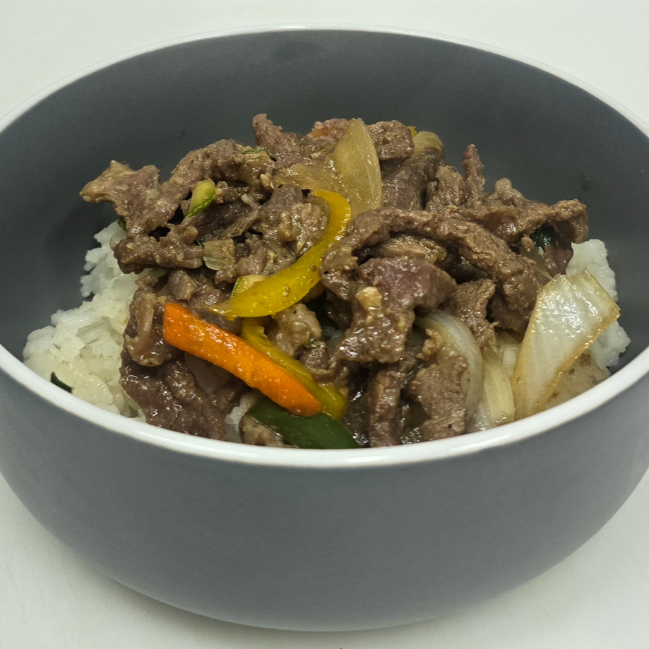 ARROZ COCIDO AL VAPOR CUBIERTO CON CARNE DE RES AMARINADO COCIDO CON SUS VERDURAS