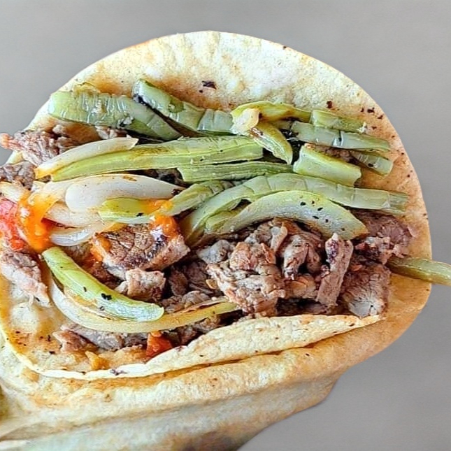 tortilla de harina,carne asada,queso,nopal y cebolla asados