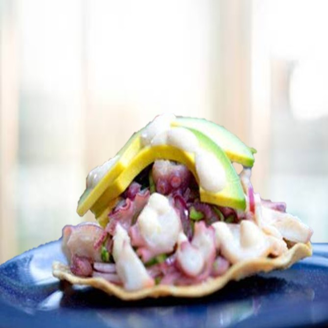 Pulpo, piña, cebolla y chile sobre base de guacamole.