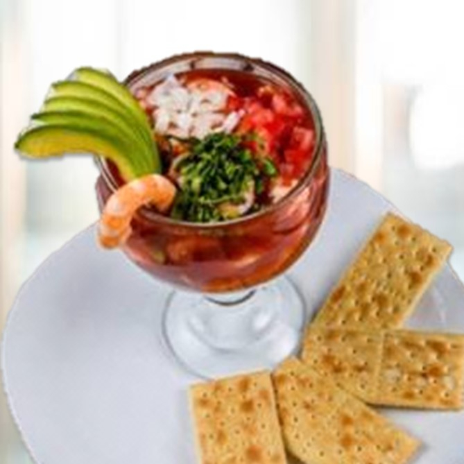 Camarón, cebolla, cilantro, aguacate y salsa de tomate.