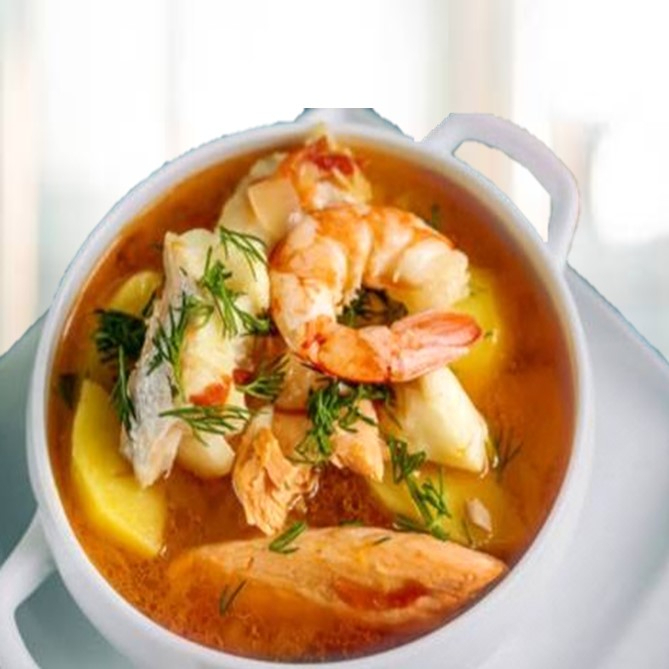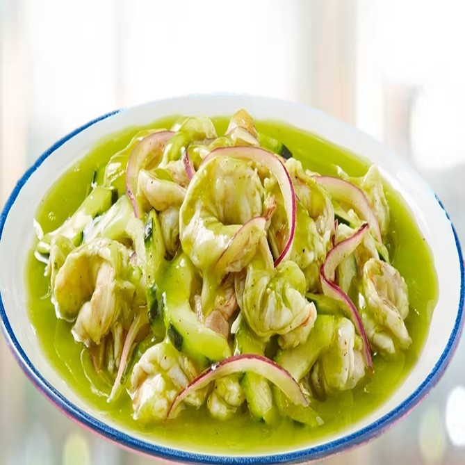 Camarones frescos cocido en jugo de limón, con bastones de pepino, cebolla morada y aguacate.