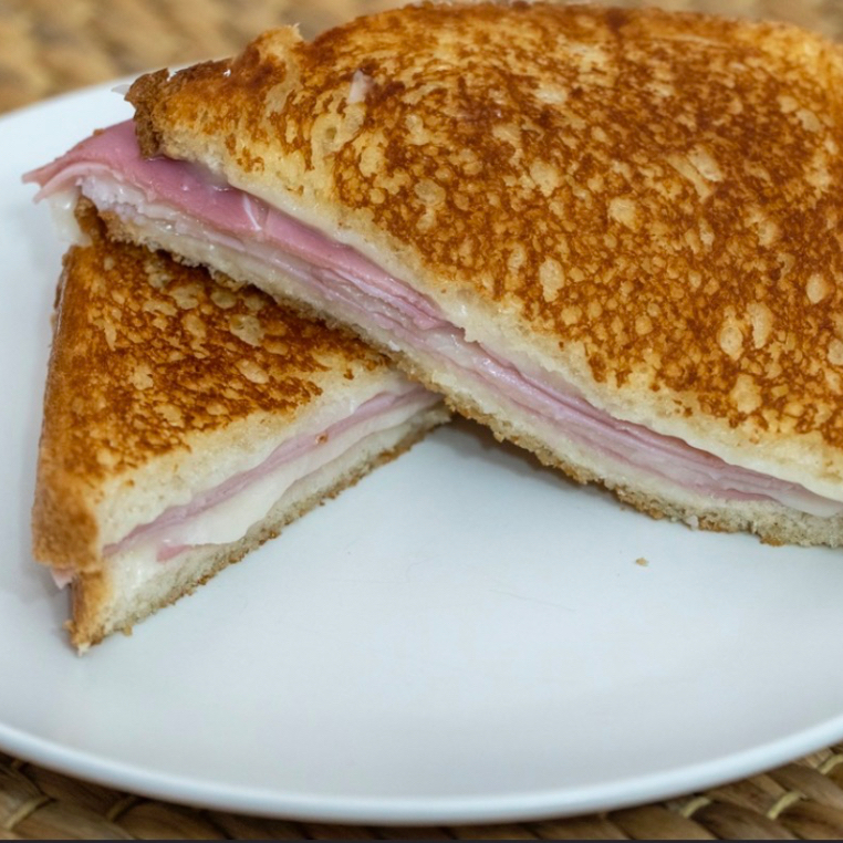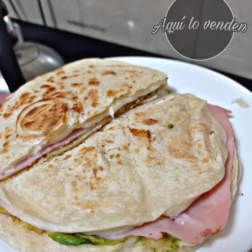 Jamón, queso amarillo, queso Oaxaca. Aguacate, jitomate, cebolla Y salsa