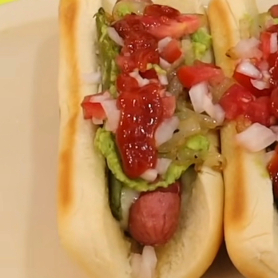 Salchicha, cebolla, jitomate, chile, catsup, mostaza y mayonesa