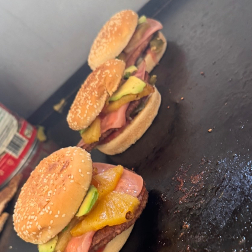 Doble Carne, jamón, queso amarillo, aguacate, jitomate, cebolla, chile, mayonesa, catsup y mostaza