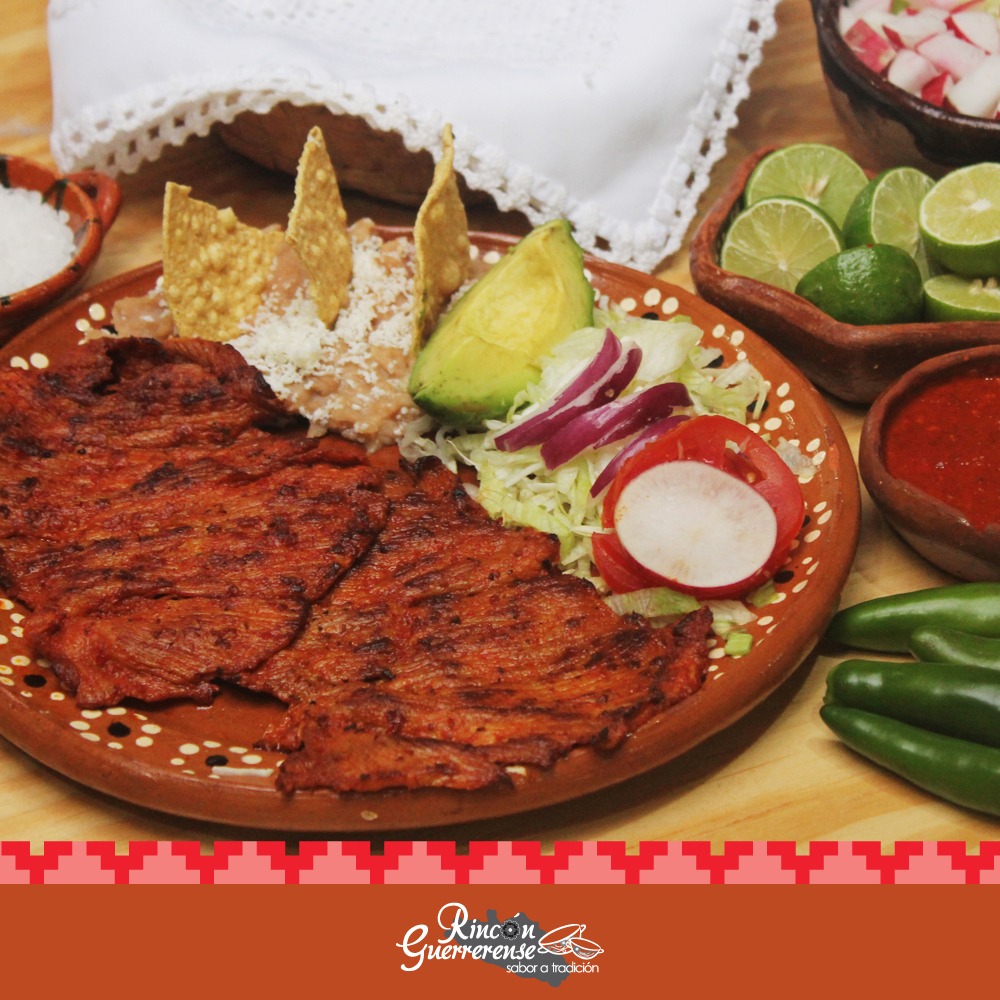 Estilo guerrero, preparado con carne de cerdo, se acompaña con aguacate, doradas, chicharrón, cebolla, limón y chile.