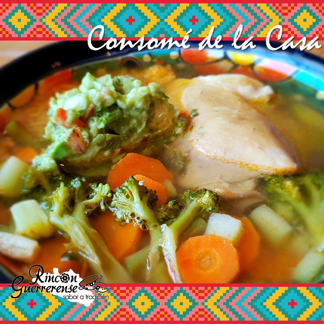 Consomé de pollo con verduras, pieza de pollo, arroz y guacamole.