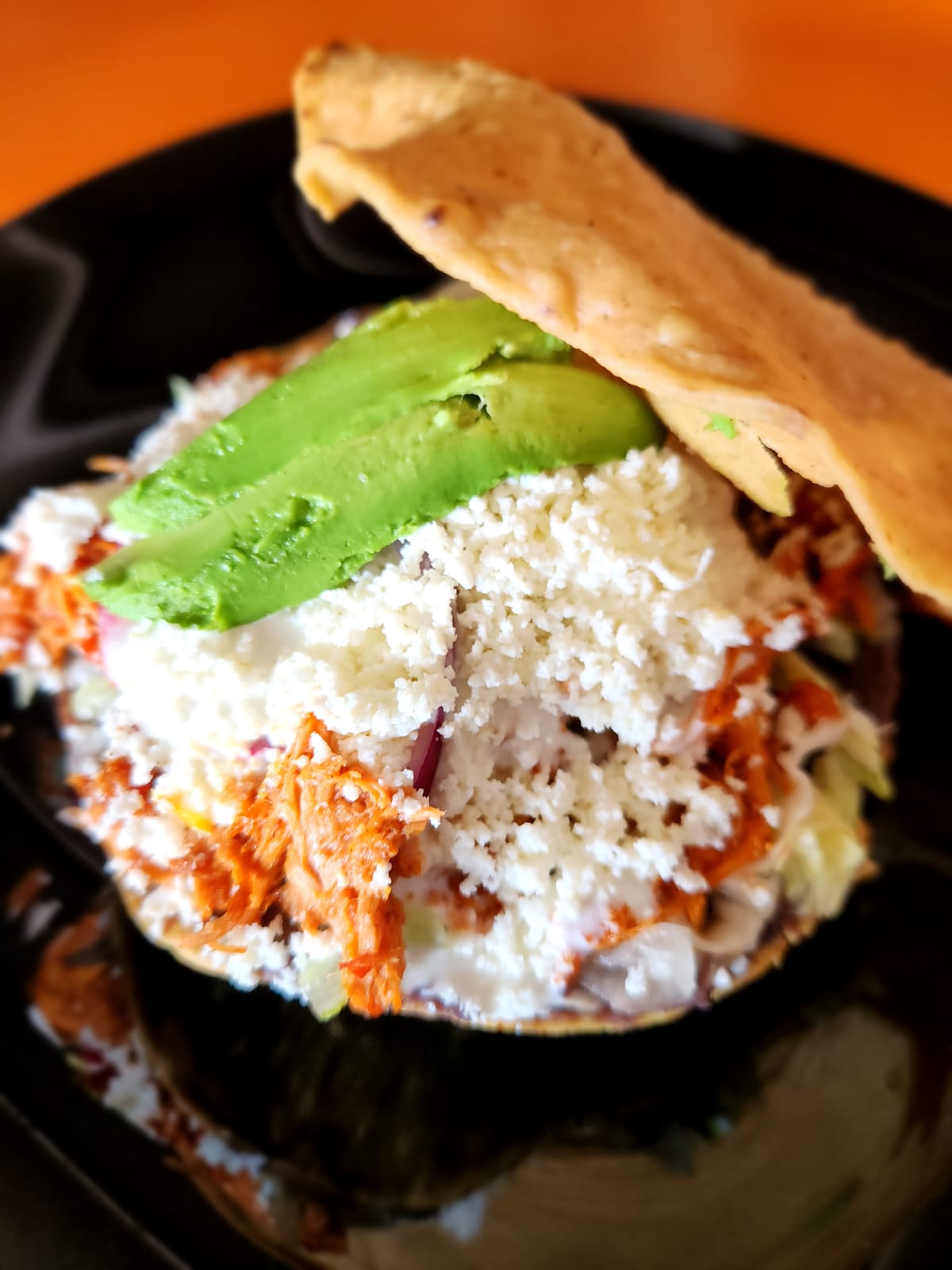 Rica tostada casera, untada con frijoles, tinga estilo guerrero, verdura, queso y crema.