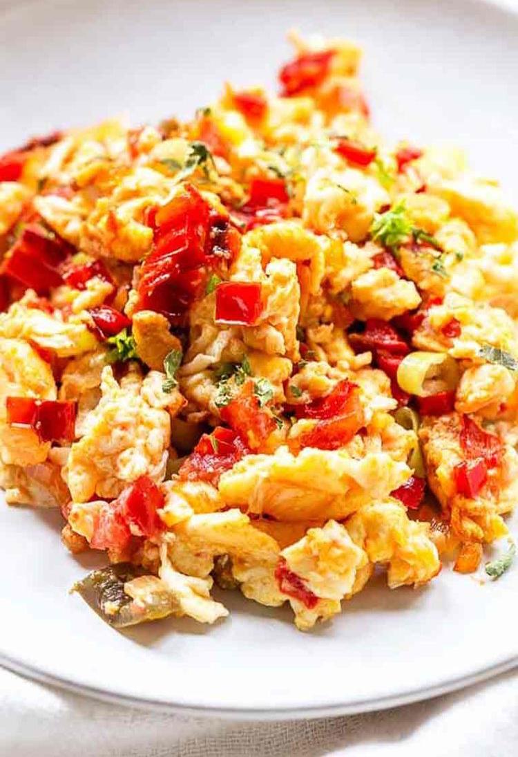 2 Huevos revueltos con jitomate, cebolla y chile verde.