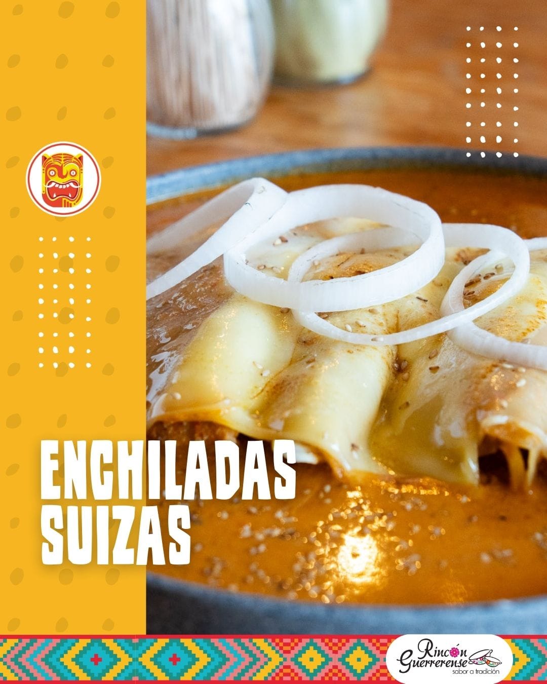 4 enchiladas rellenas de pollo bañadas con la salza de la casa, gratinadas y coronadas con rodajas de cebolla.